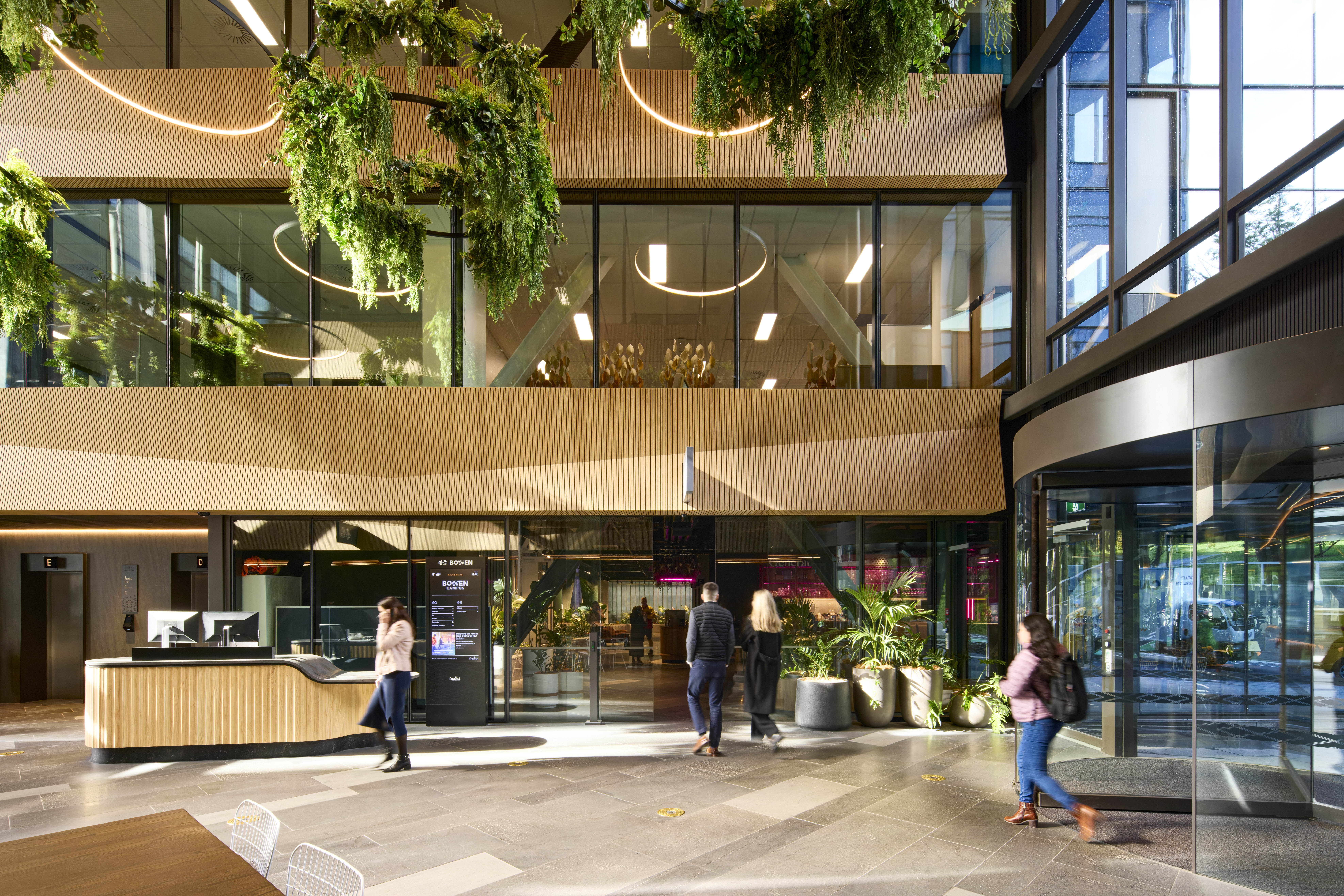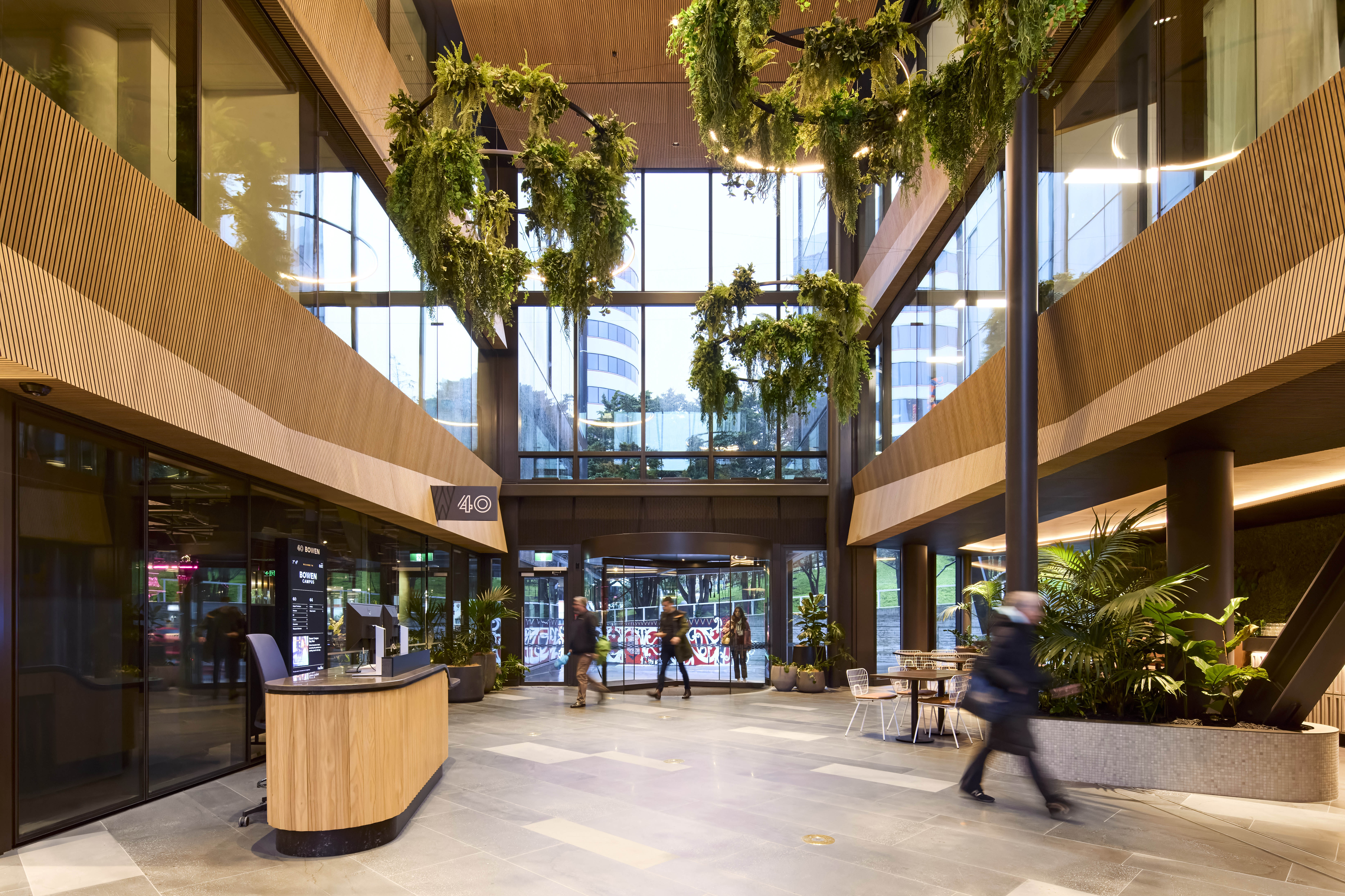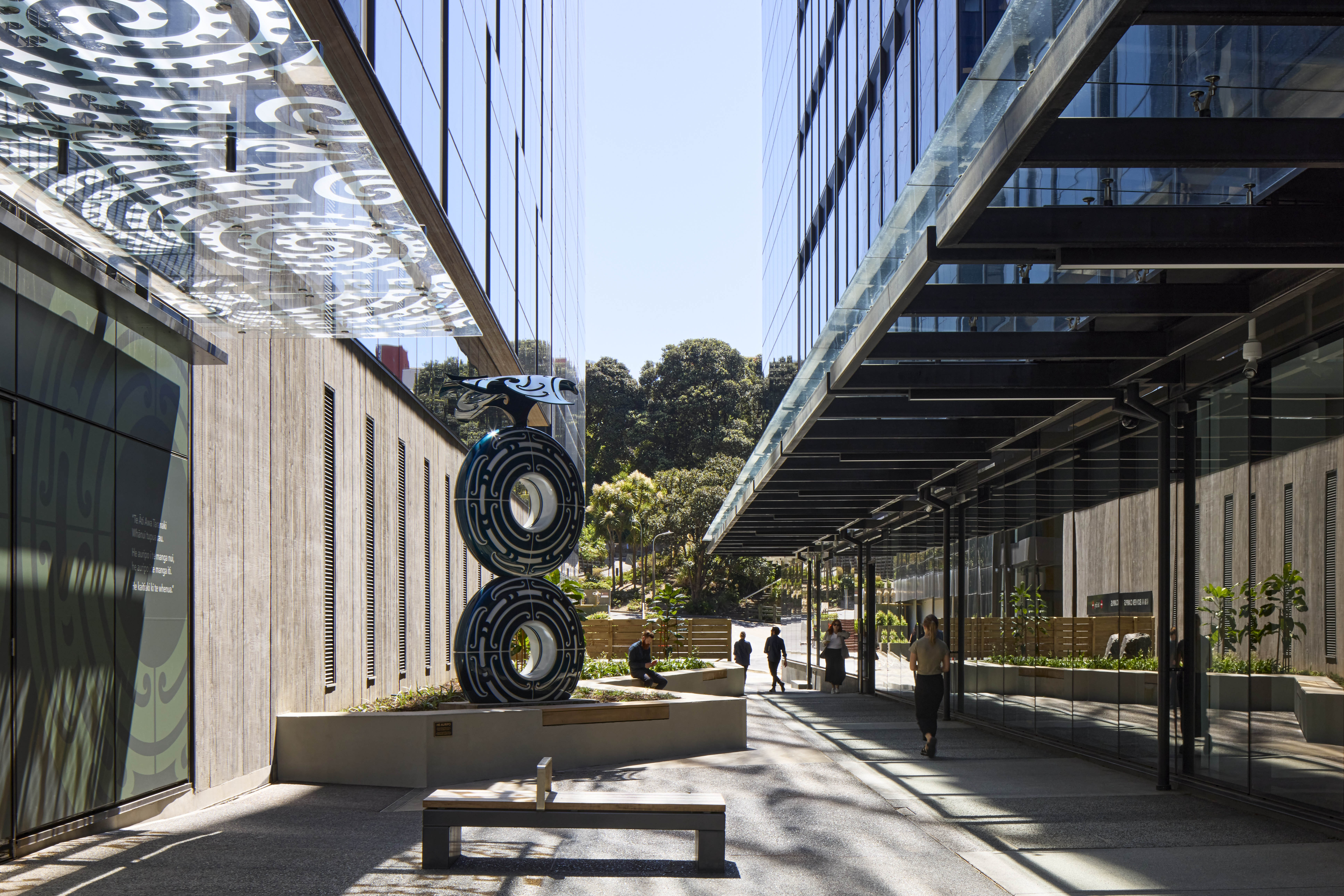 The project strategically addresses a key site left in disarray since the 2008 Global Financial Crisis. New life is given to the heart of the parliamentary precinct by creating two buildings that are braced against the old bones of Charles Fergusson Tower and Bowen State Building. Landscaped laneways connect to the giant Bowen Campus; it’s warm heart can be seen in the shared atrium of the new buildings. The double-height space, clad in timber and adorned with greenery, gives respite from the busy surroundings. The buildings carefully address all sides of the site, including the challenging Wellington Urban Motorway to the west. The Bowen St façade cleverly addresses the concave curve of the street, while the generous footpath improves the pedestrian experience. Finely detailed ‘fins’ add dynamism to the sawtooth façade, which is also reflected inside. The technological response to earthquake resilience is innovative and materials enhance sustainability, granting the building a 5-star Green Star rating.