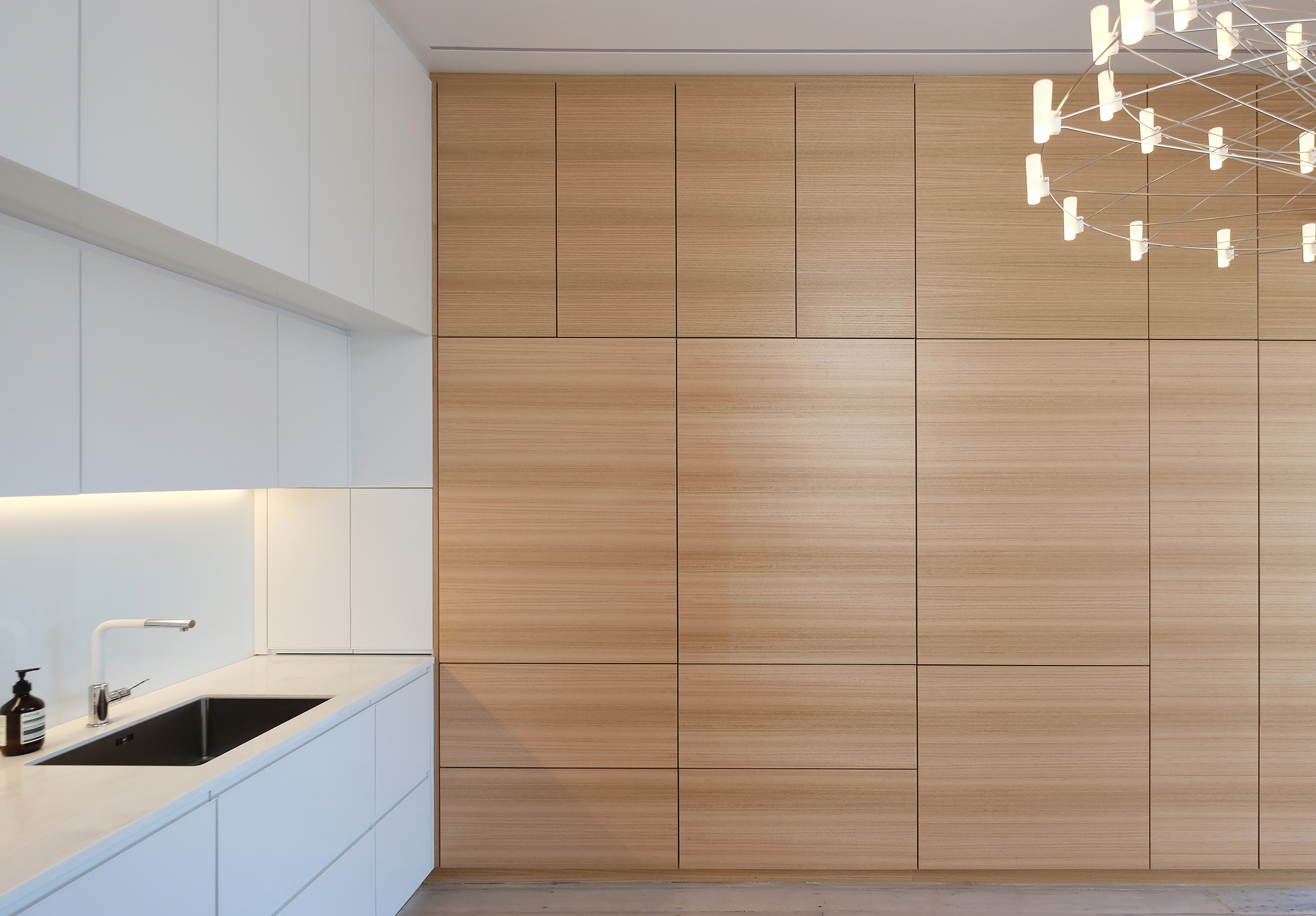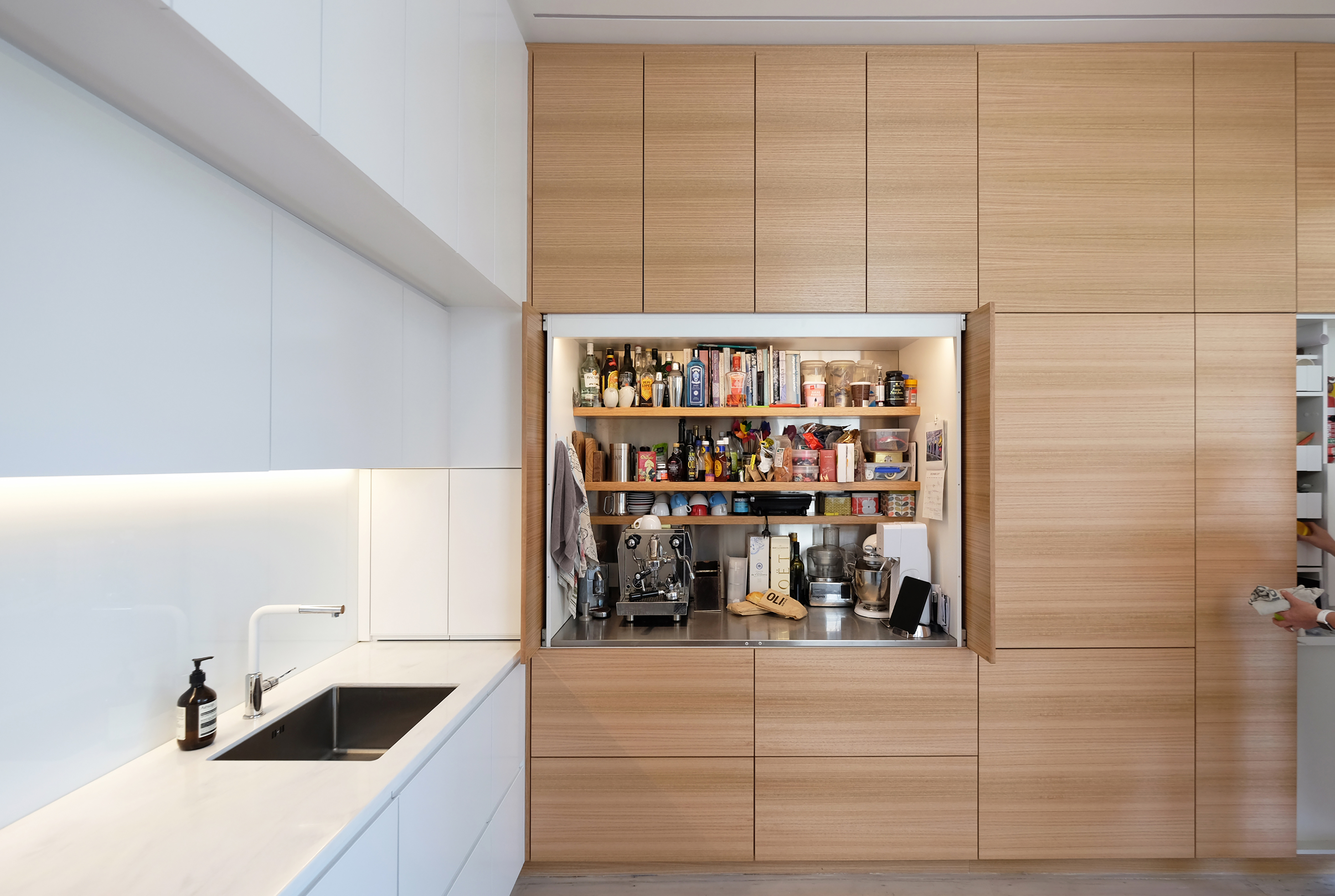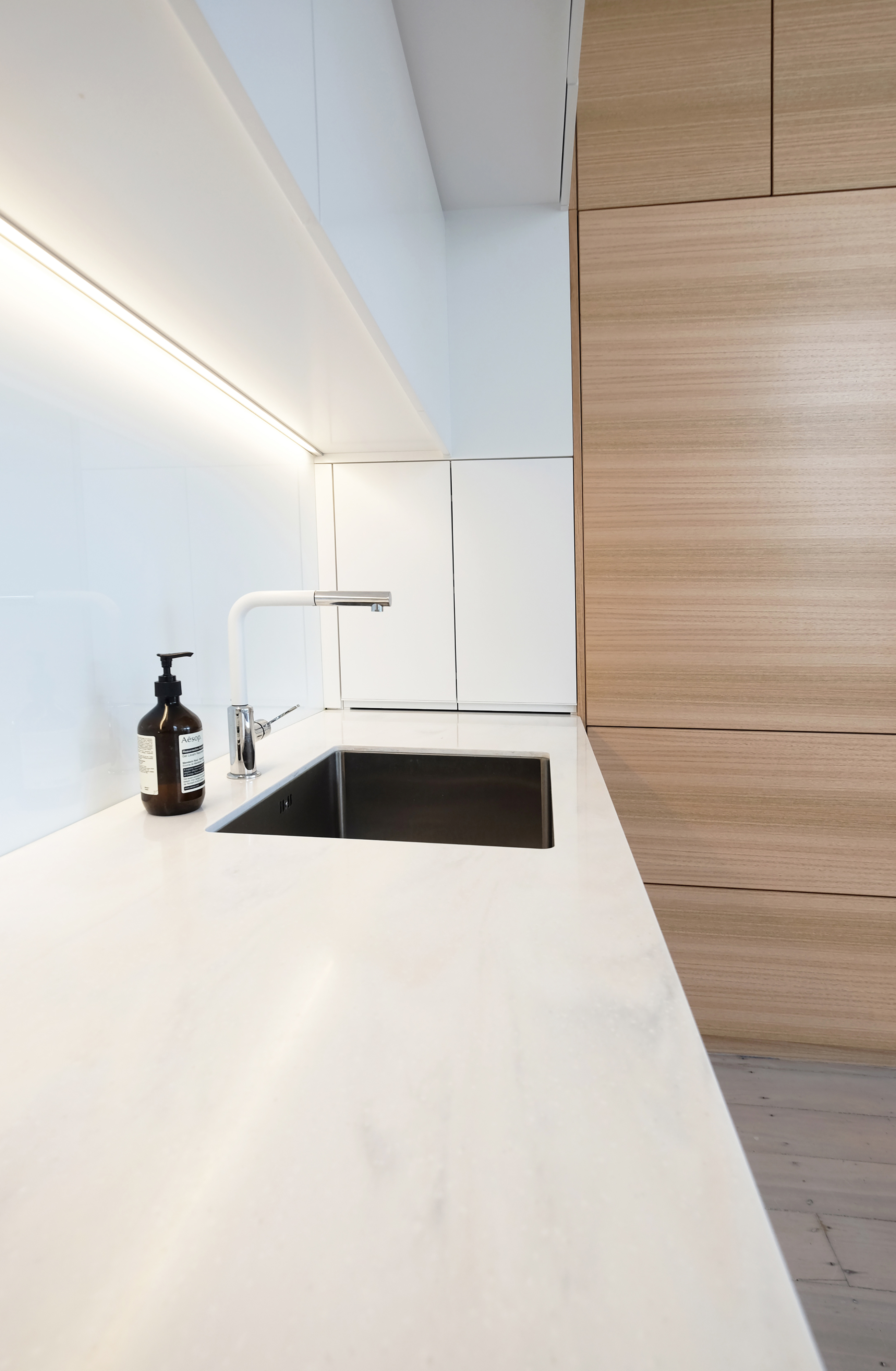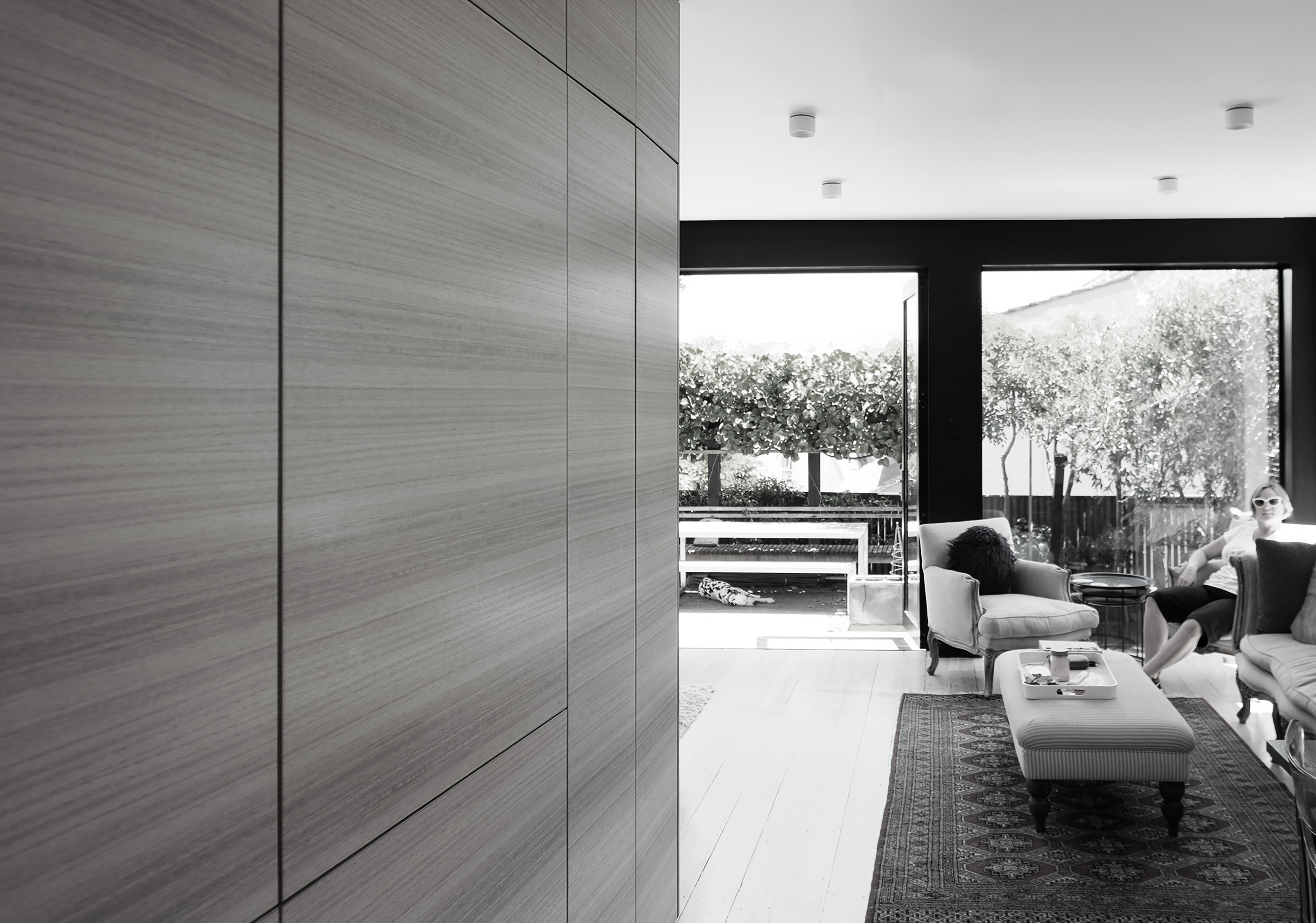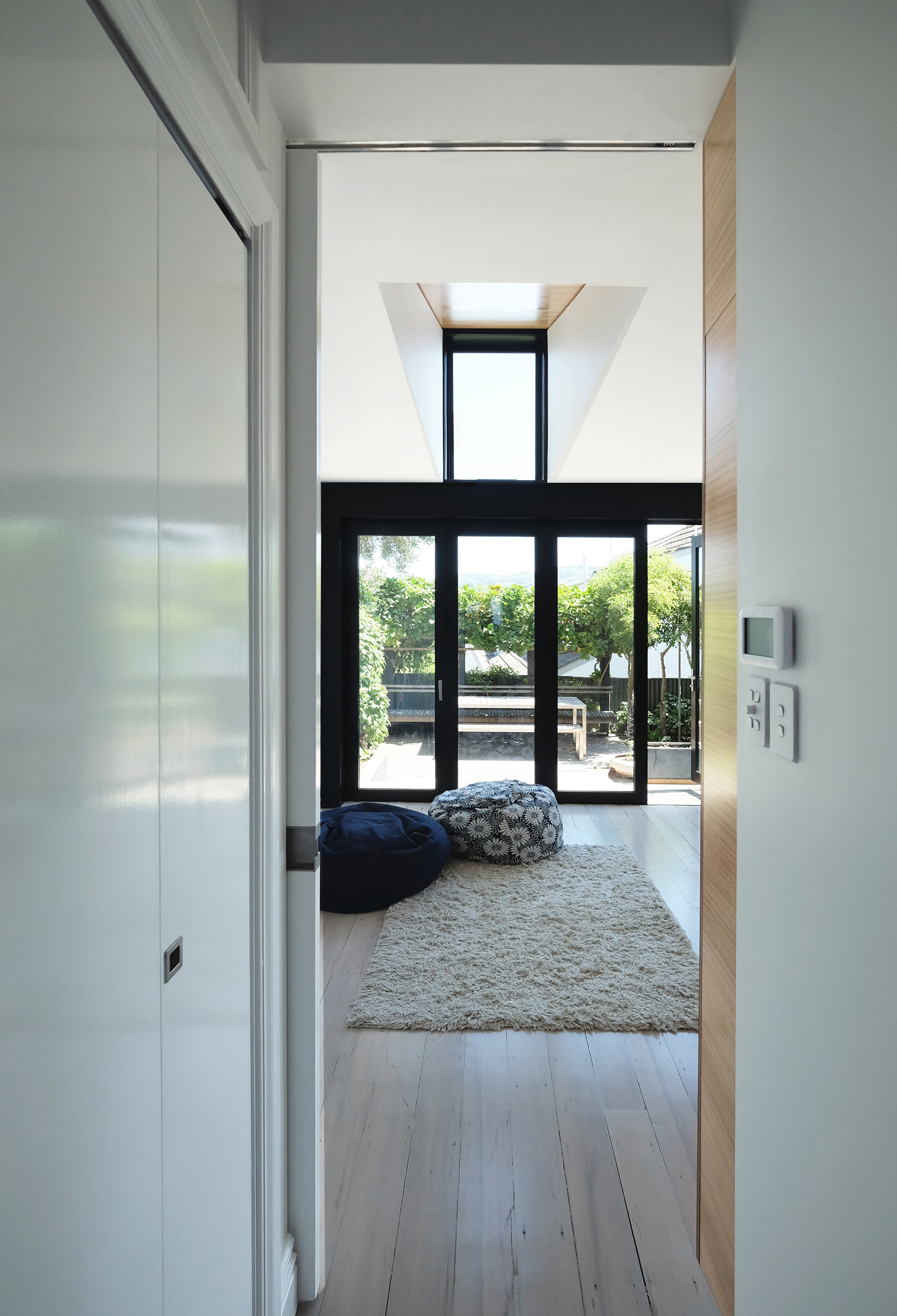 An urban intervention on a tight Mt Victoria site has generated a sophisticated solution seemingly out of thin air. The project takes a Victorian villa into a new era. Impeccable detailing – down to the level of the dog kennel and colour-coordinated dog – and crafting of timber joinery allows the house to integrate well into its back yard, and unifies hallway, skylight and rear elevation in a well-composed arrangement.