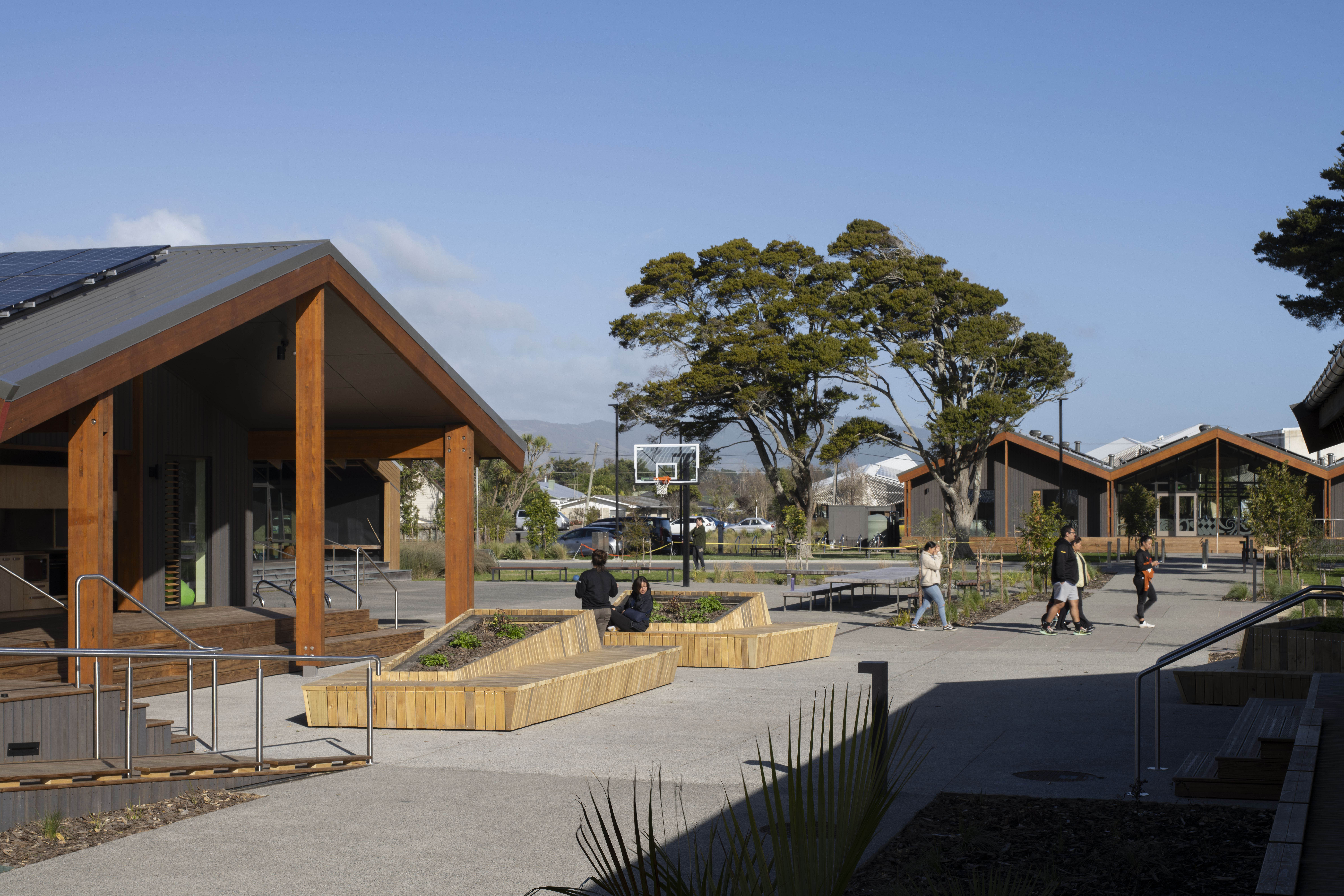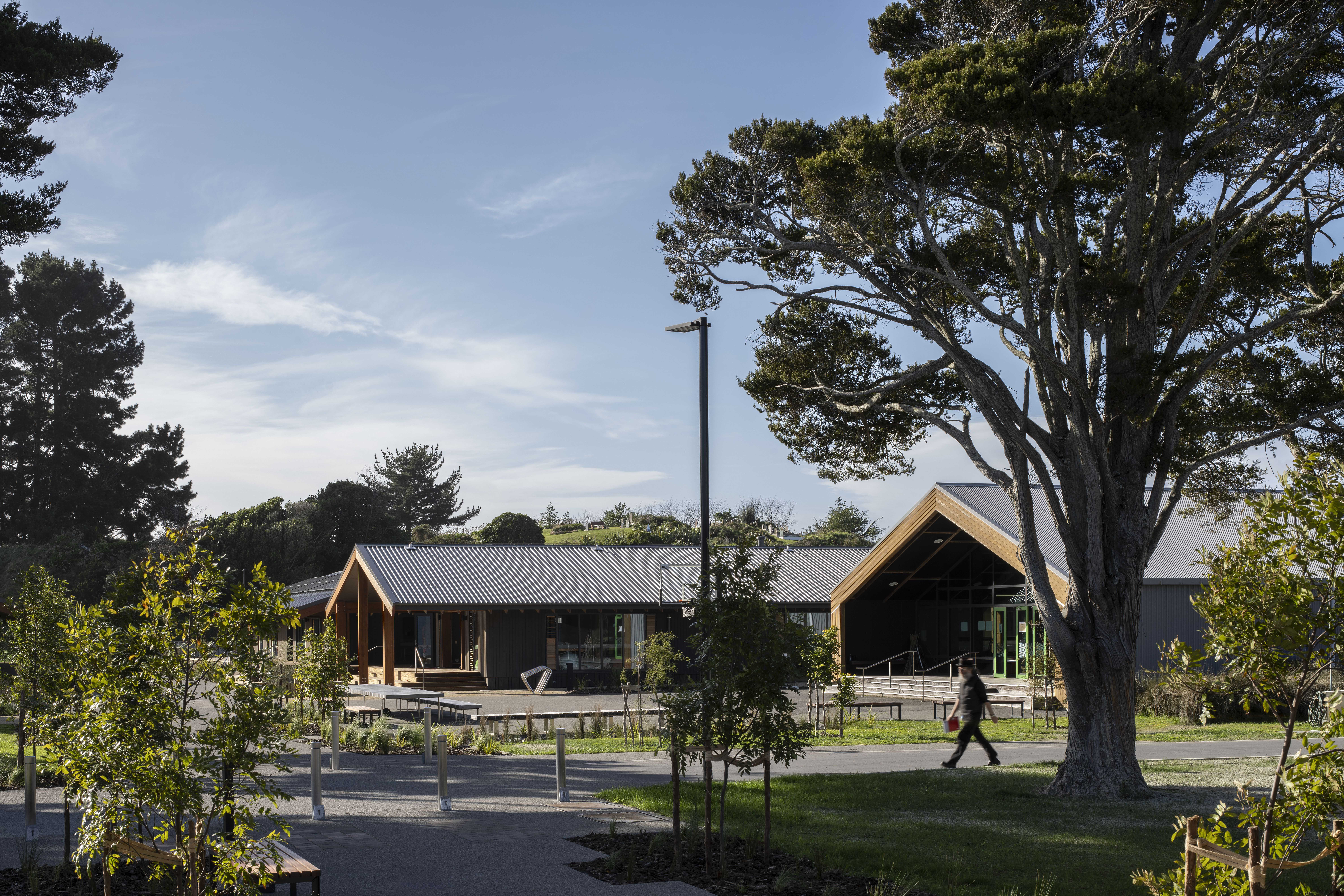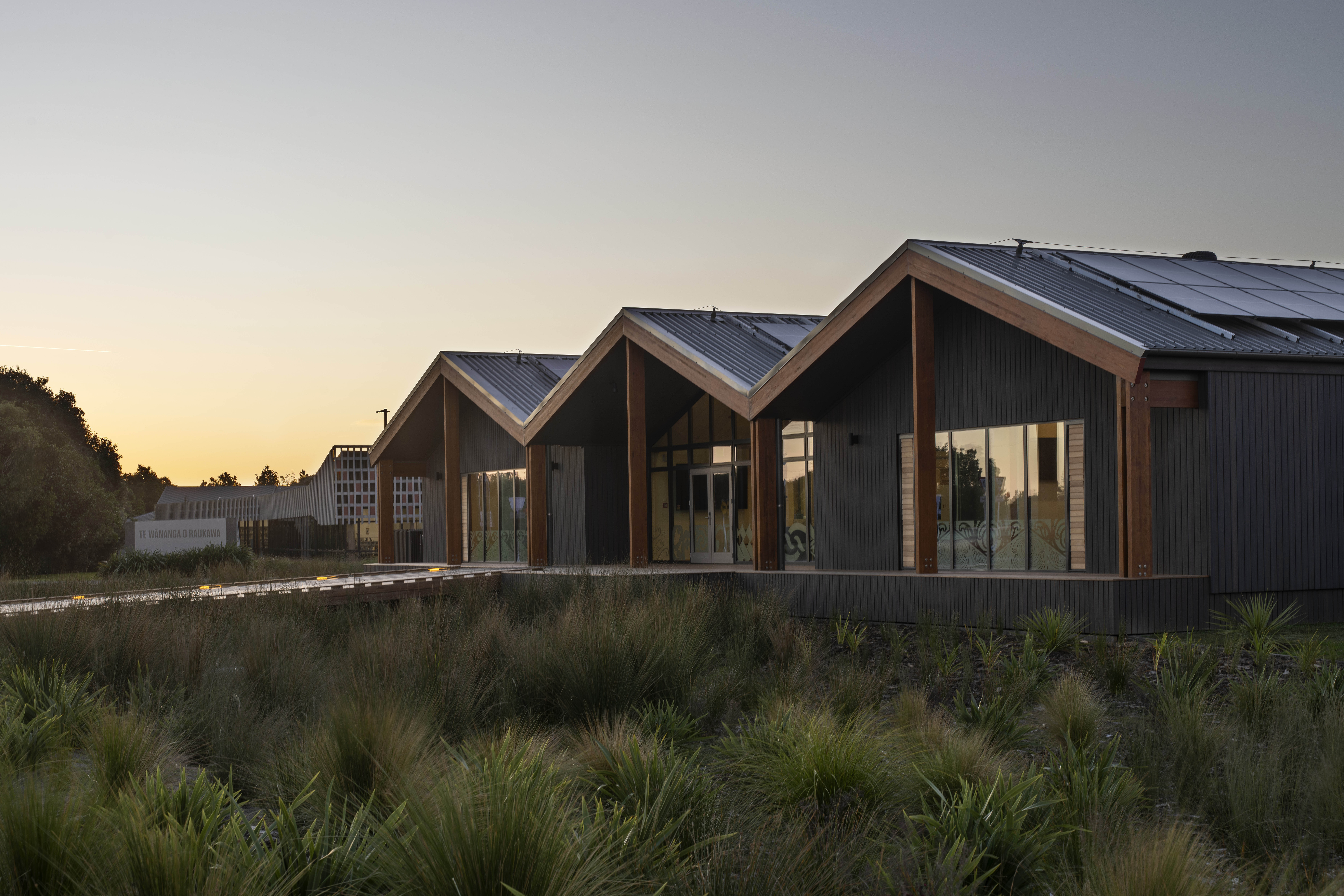 This significant project embodies kaitiakitanga to meet Living Building Challenge requirements, only the second to do so in Aotearoa. There is a ripple effect from the goal to create these self-sufficient and regenerative buildings – suppliers, contractors and subcontractors will take their learnings to other projects. The iringa kōrero, a back-lit patterned plywood canopy welcomes visitors with diffused light and directs them to the heart of the campus. The landscaping and strong gable forms that create a cluster of new whare are viewed as a cohesive system. The new te reo Māori ānake buildings are understated, yet elegant in their design intent and relate strongly to attenuated raingardens, water storage, plantings and plazas. Repeated forms create a sense of community. Timber decks, steps, ramps and seats weave and engage with plantings and plazas.