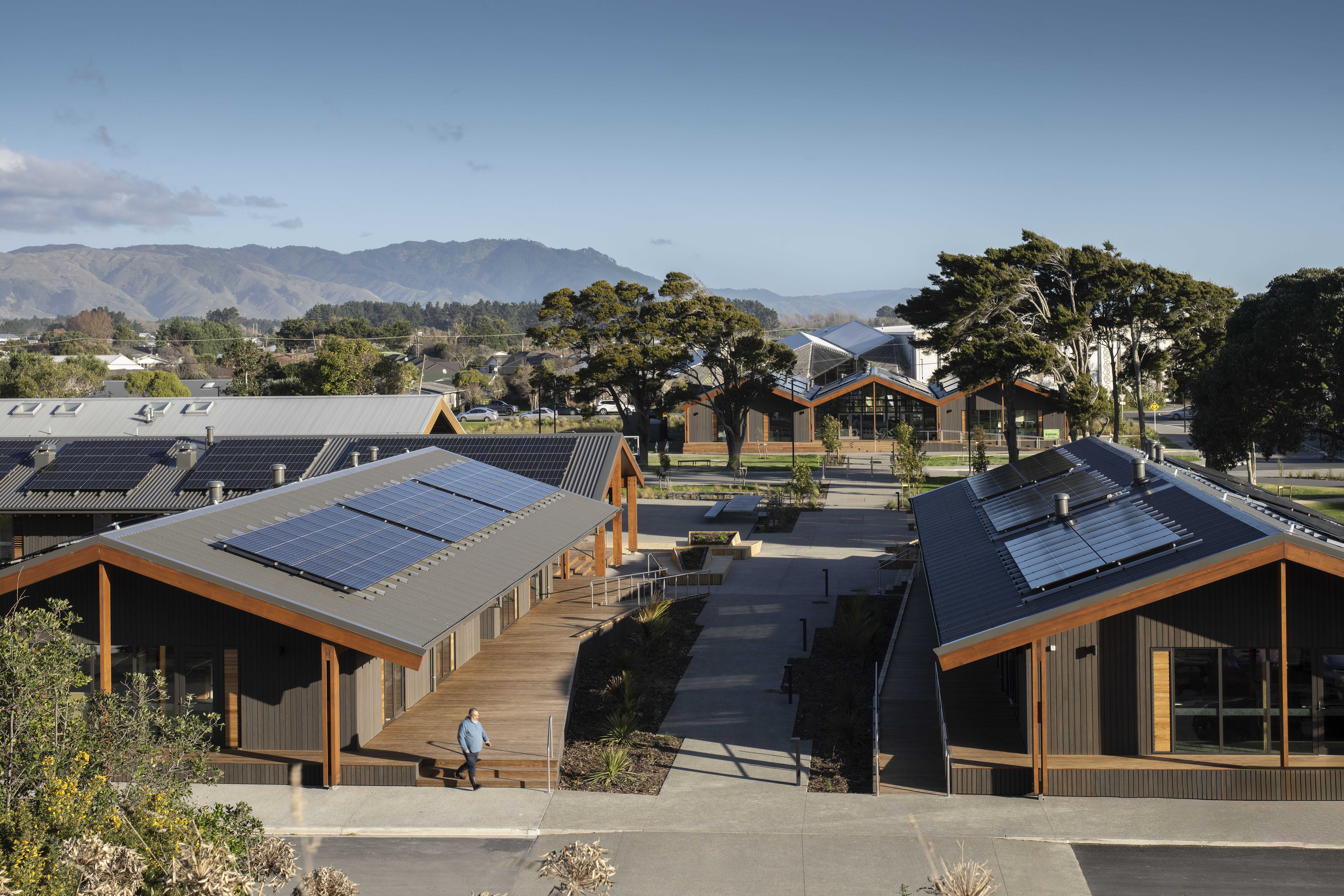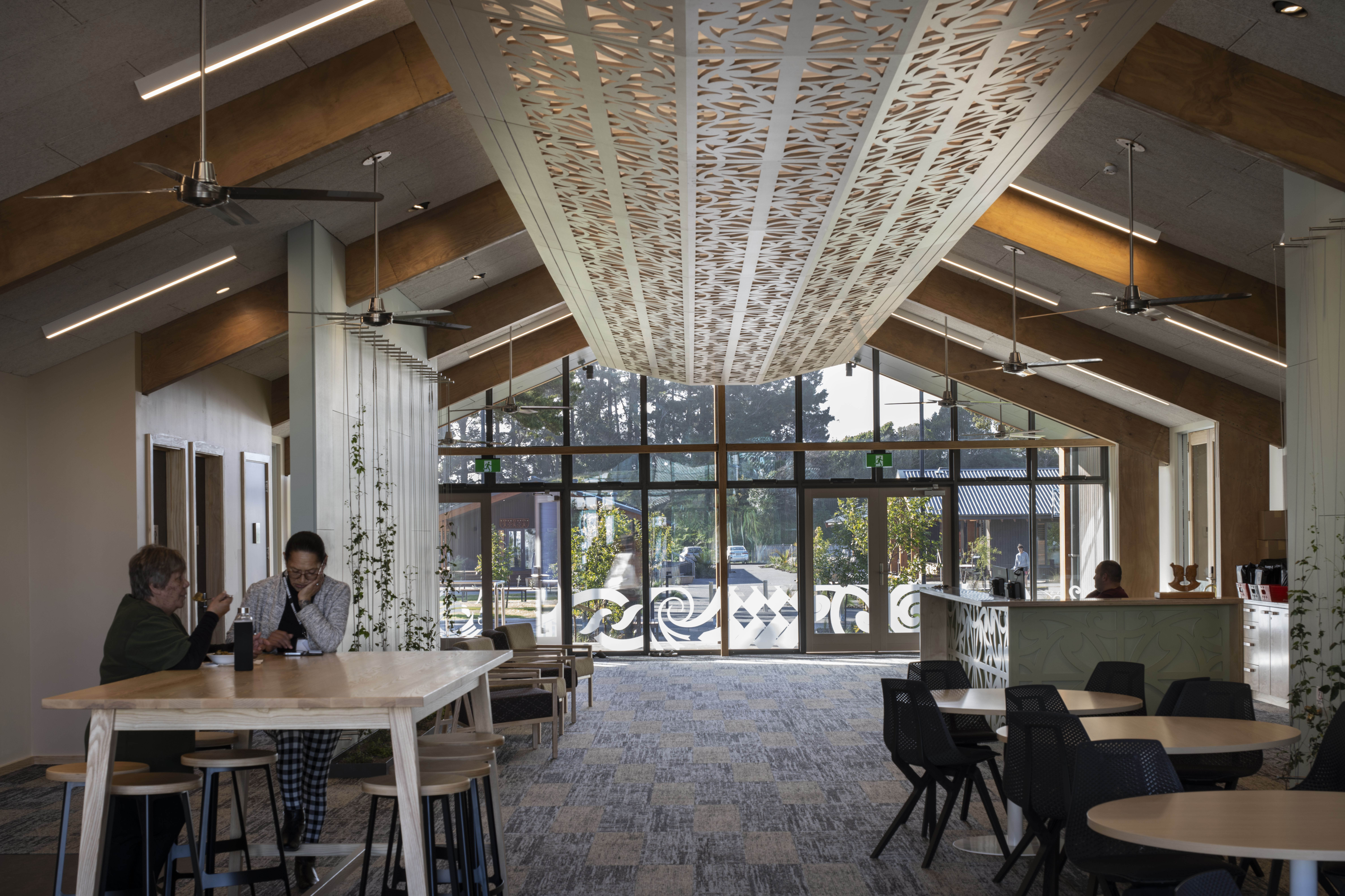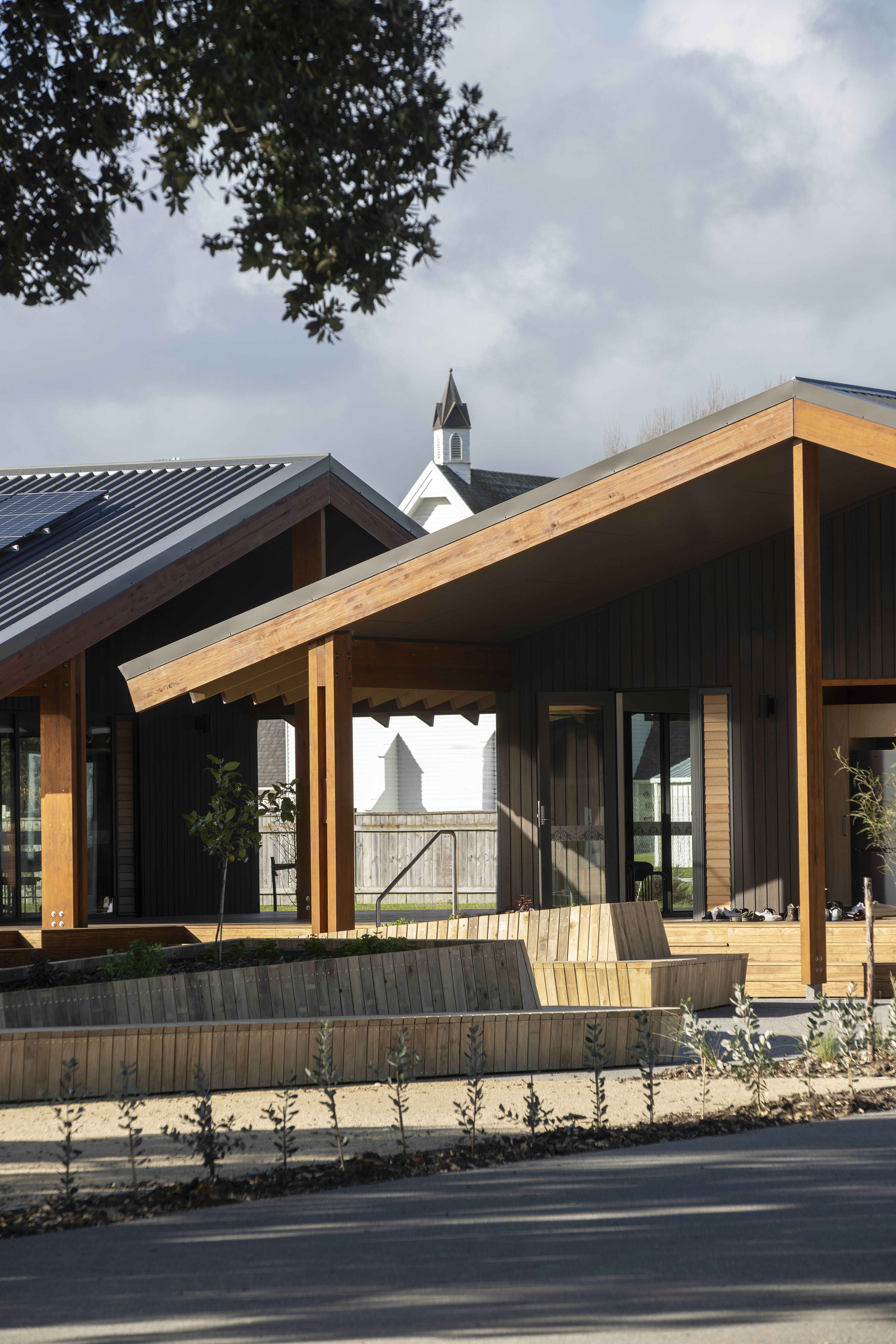 This significant project embodies kaitiakitanga to meet Living Building Challenge requirements, only the second to do so in Aotearoa. There is a ripple effect from the goal to create these self-sufficient and regenerative buildings – suppliers, contractors and subcontractors will take their learnings to other projects. The iringa kōrero, a back-lit patterned plywood canopy welcomes visitors with diffused light and directs them to the heart of the campus. The landscaping and strong gable forms that create a cluster of new whare are viewed as a cohesive system. The new te reo Māori ānake buildings are understated, yet elegant in their design intent and relate strongly to attenuated raingardens, water storage, plantings and plazas. Repeated forms create a sense of community. Timber decks, steps, ramps and seats weave and engage with plantings and plazas.