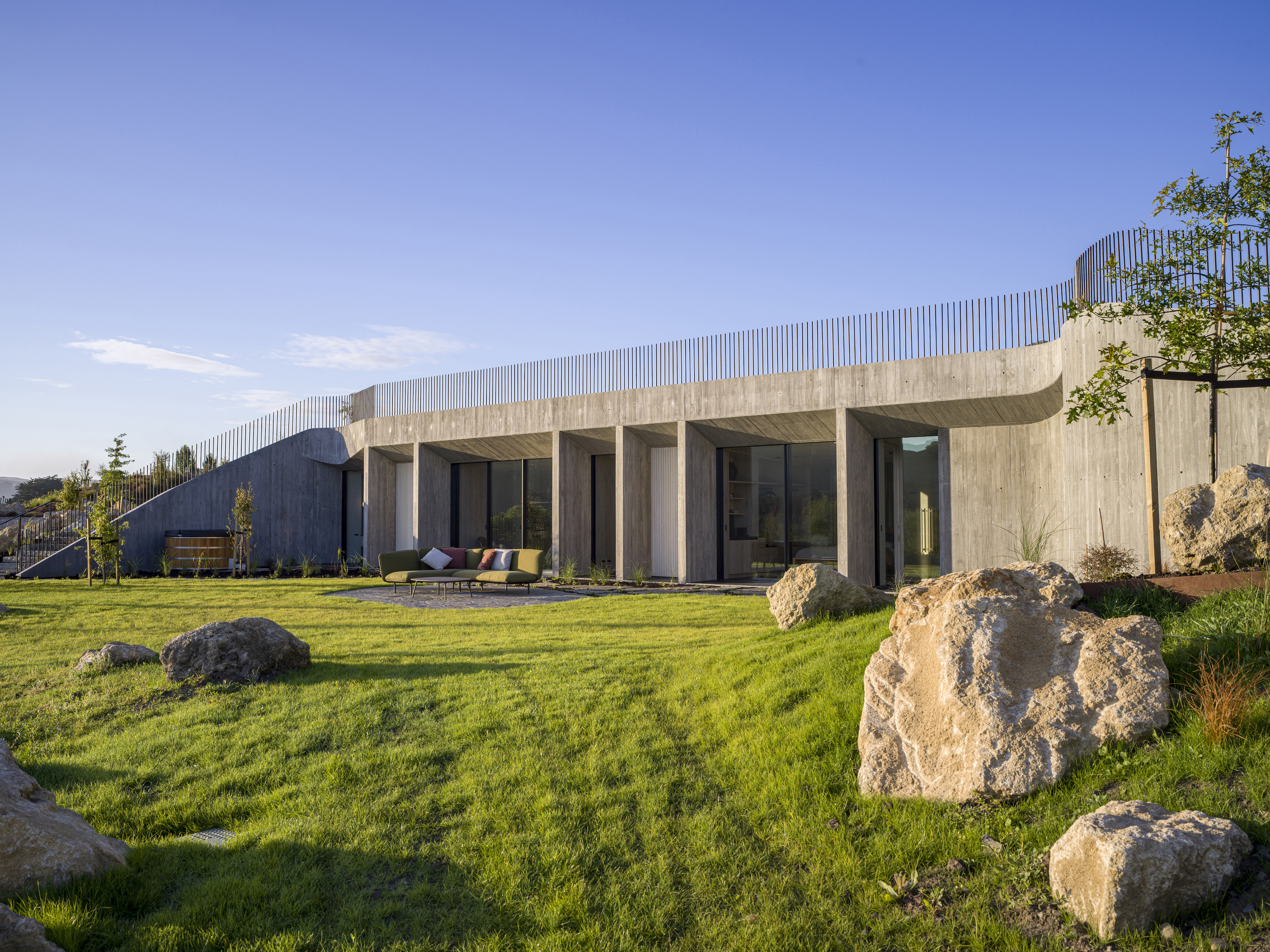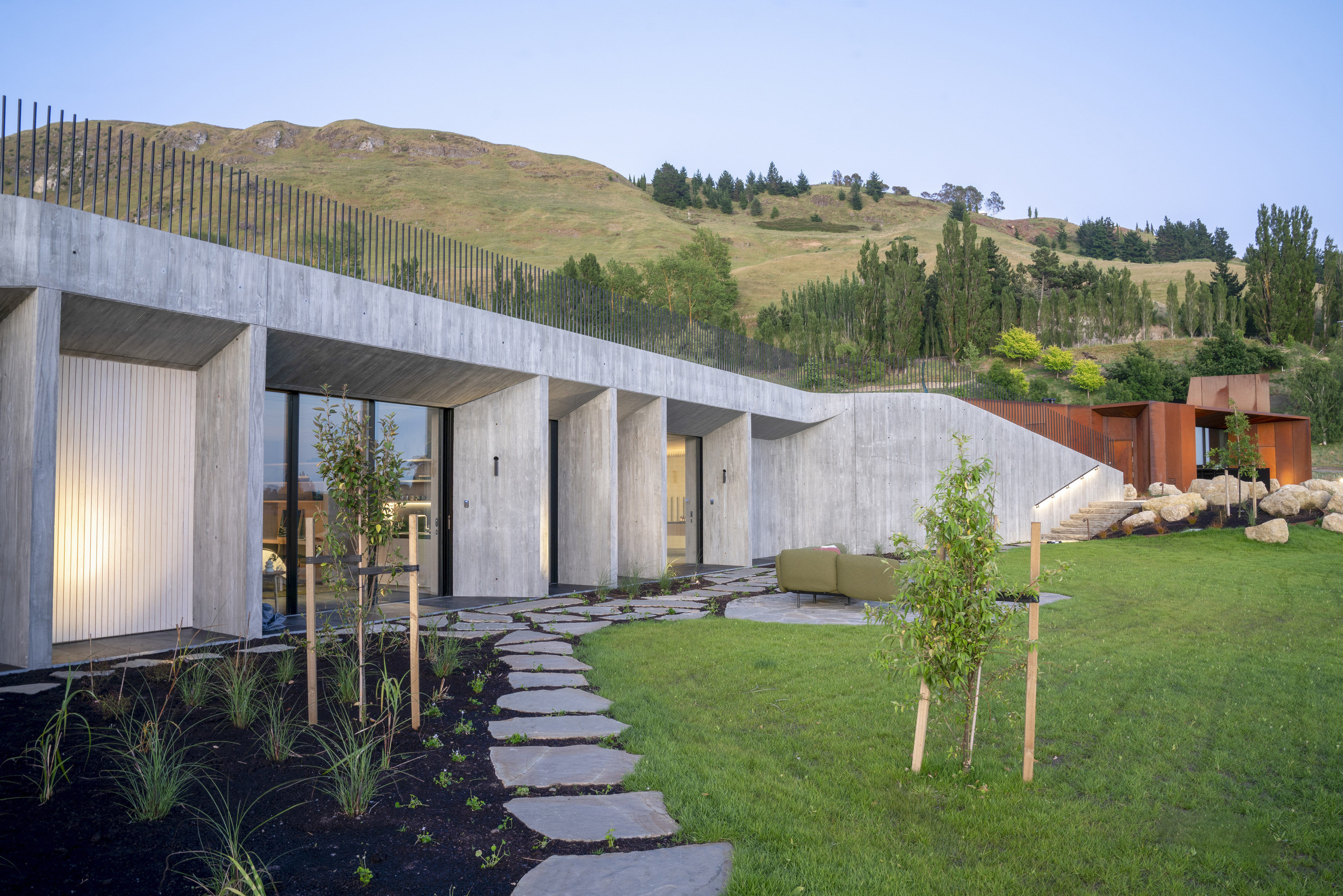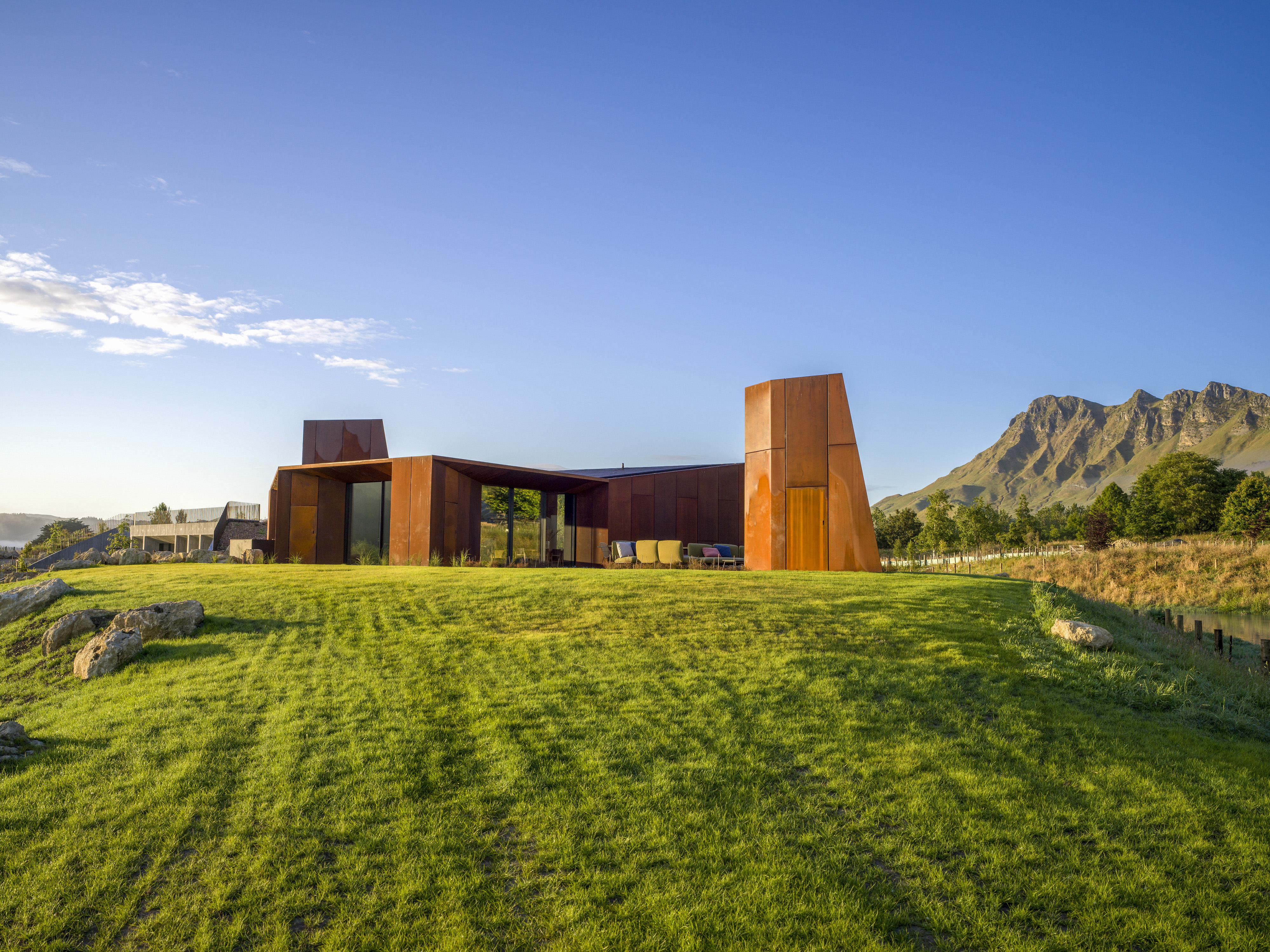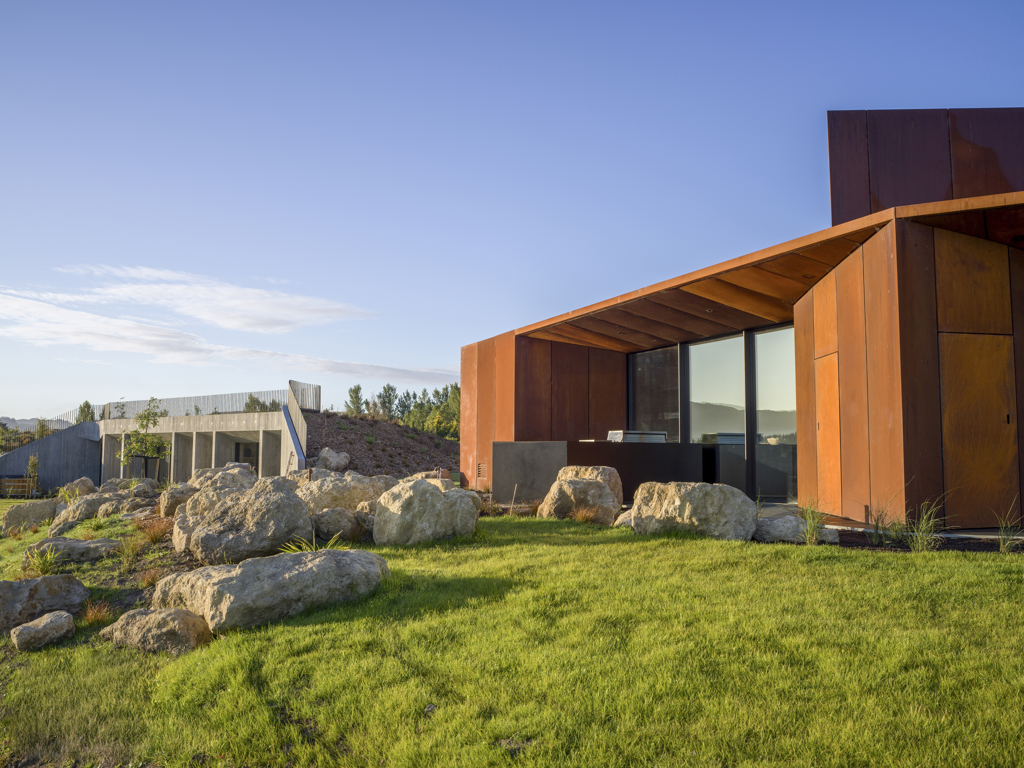 Te Mānia is a sculptural and immersive architectural response to the enduring presence of Rongokako. Clever, restrained landscaping is integral to the experience. Visitors leave their vehicles behind and move slowly through planting that announces itself quietly — a curated wildness that feels both natural and intentional. This journey draws attention to the body’s scale in relation to the maunga and to the surrounding presence of wai, nestled by the Tukituki awa on one side and lake on the other. The progression recalls the experience of a pōwhiri, awakening the senses and preparing the spirit.The design expresses a striking duality: the Te Mānia Room, clad in weathering steel, draws guests toward a bold, social heart, its dark, womb-like interior lined in waxed raw steel. In contrast, the guest quarters retreat into the hillside — quiet, cave-like forms of concrete that seem to grow from the earth, offering stillness and sanctuary.Together, the architecture and landscape create an experience that is both grounding and transcendent.