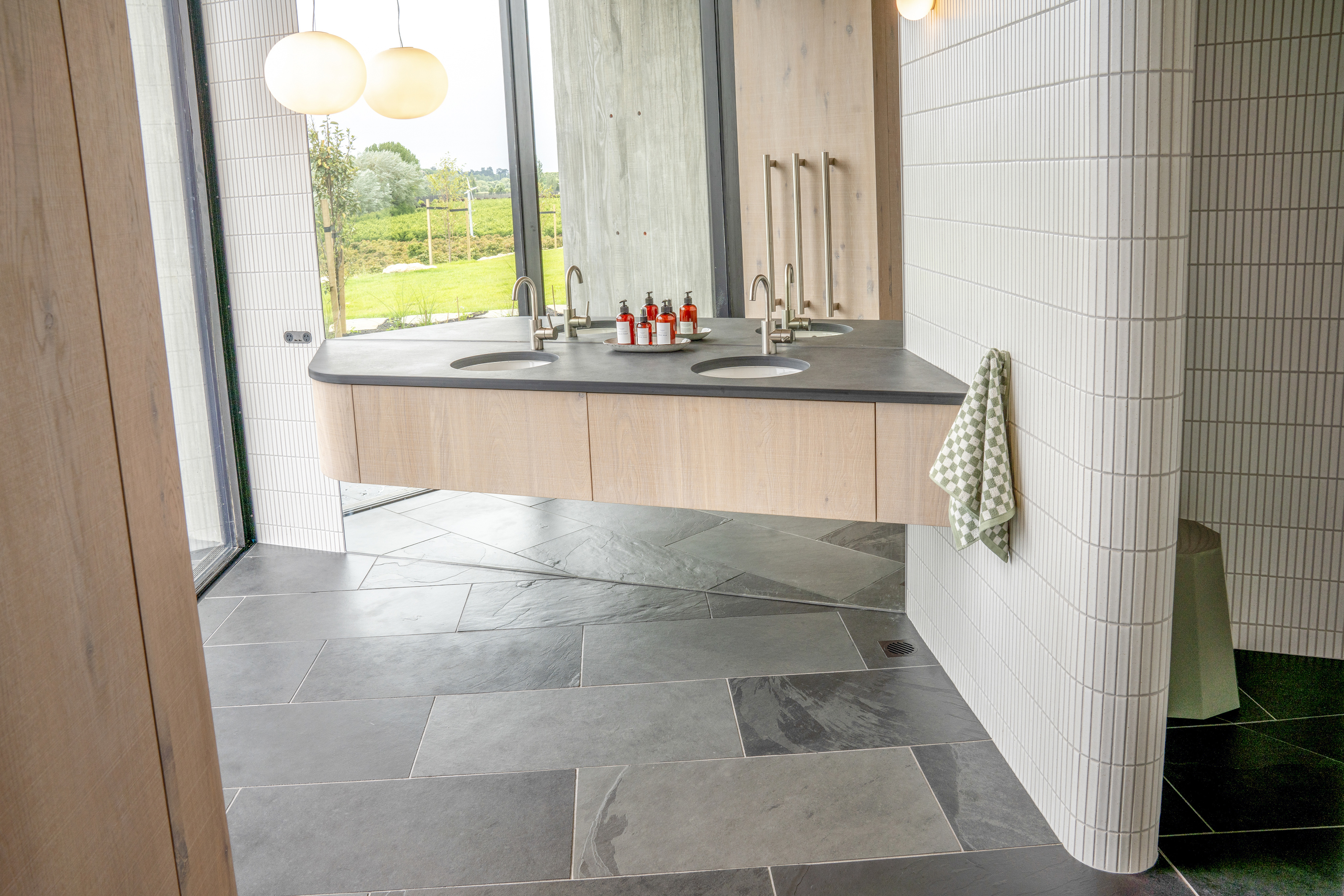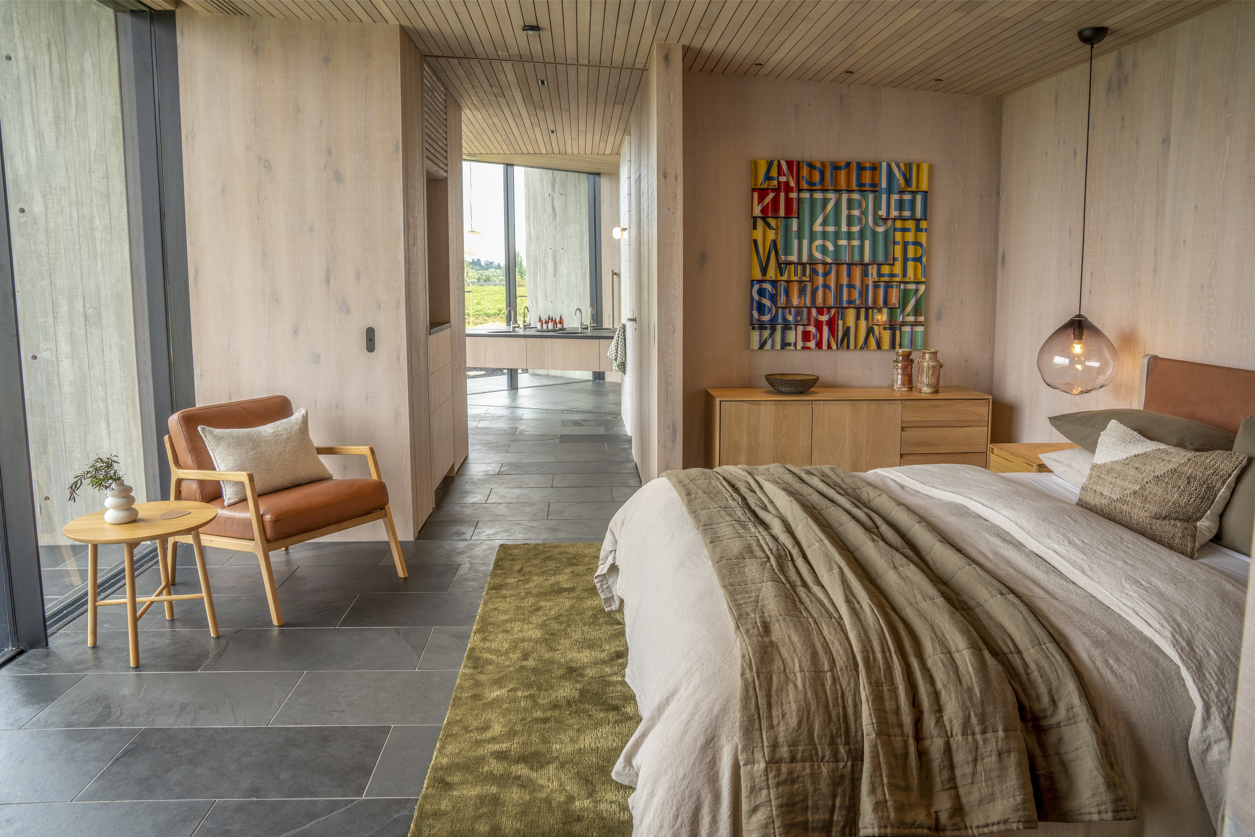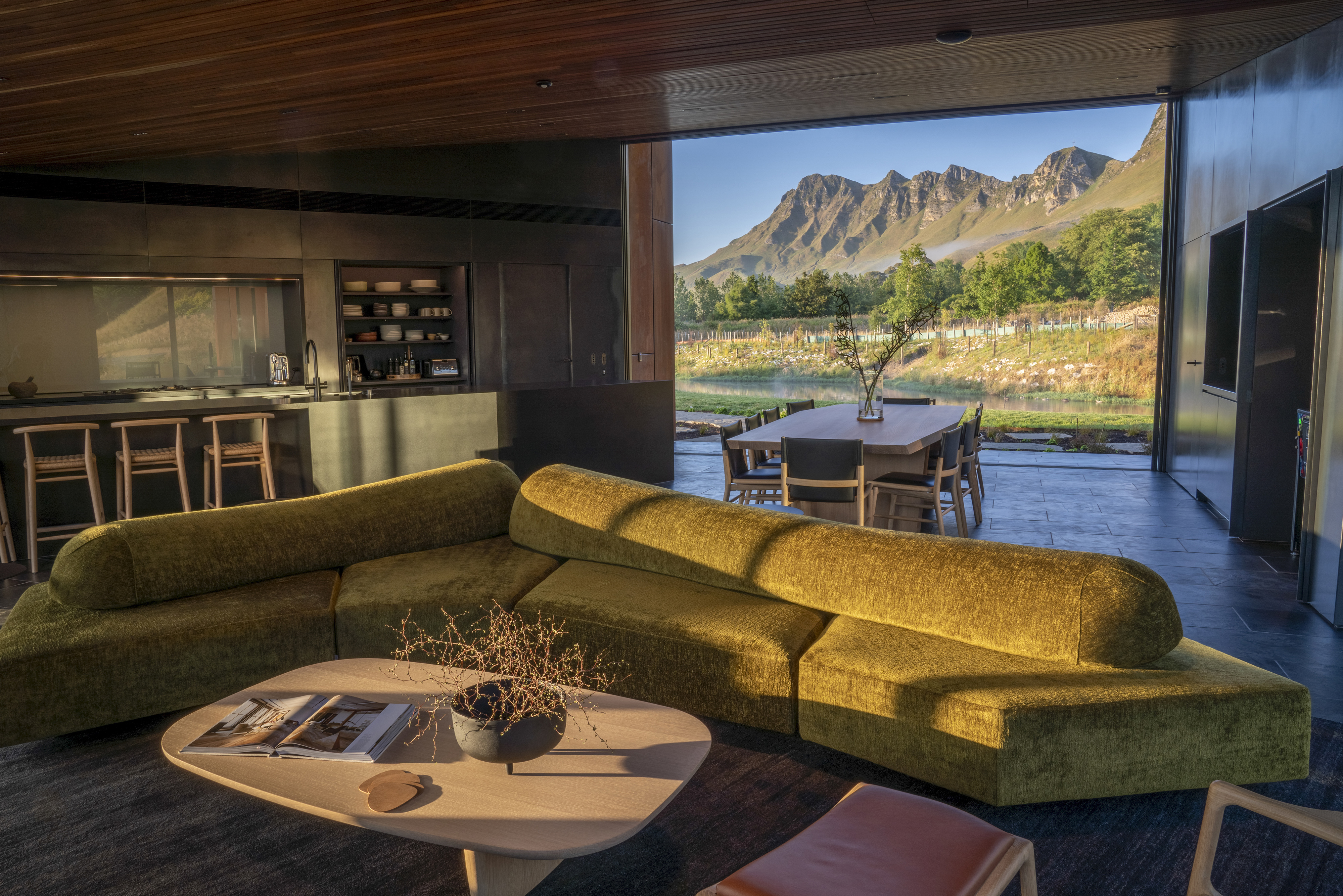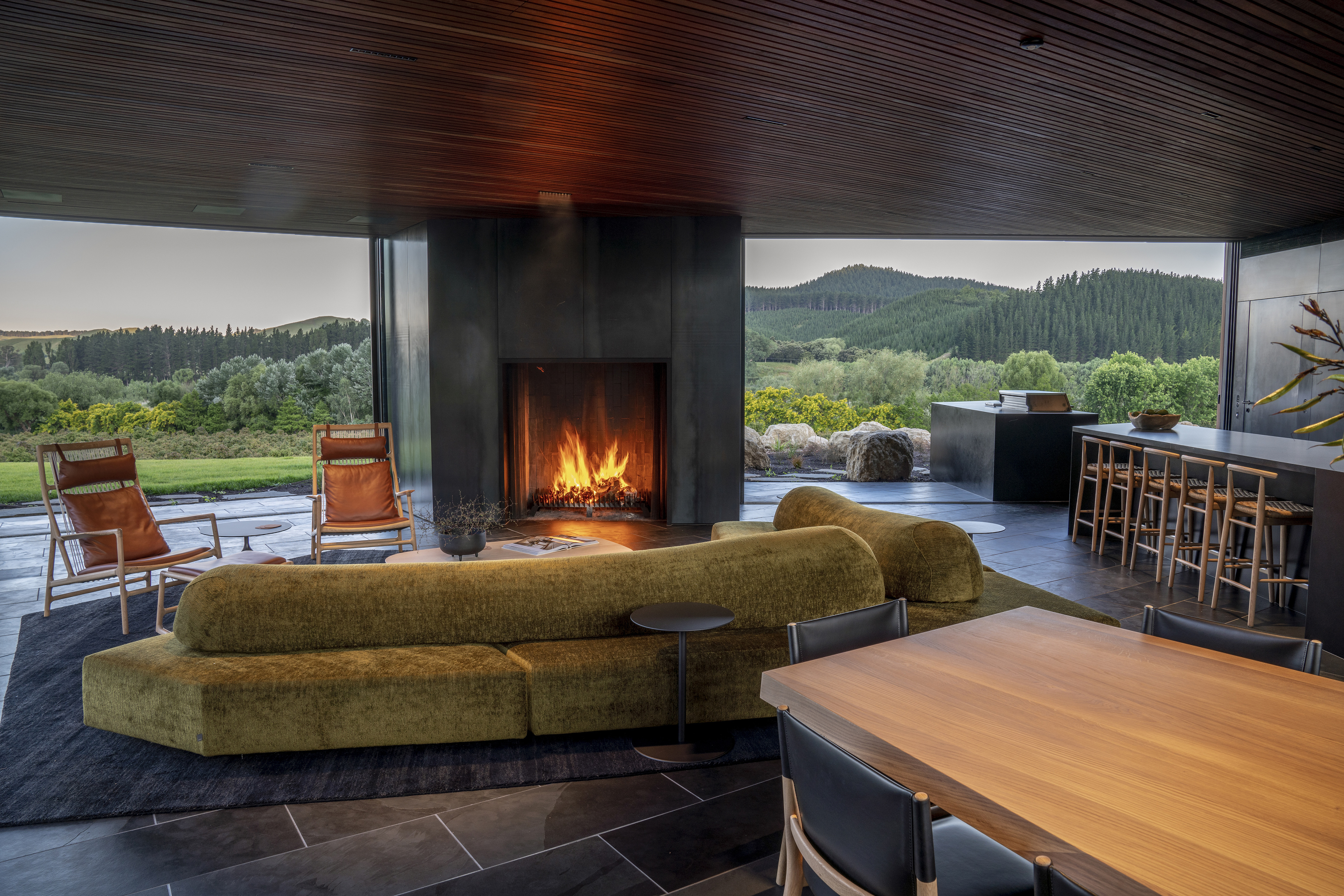 Te Mānia is a sculptural and immersive architectural response to the enduring presence of Rongokako. Clever, restrained landscaping is integral to the experience. Visitors leave their vehicles behind and move slowly through planting that announces itself quietly — a curated wildness that feels both natural and intentional. This journey draws attention to the body’s scale in relation to the maunga and to the surrounding presence of wai, nestled by the Tukituki awa on one side and lake on the other. The progression recalls the experience of a pōwhiri, awakening the senses and preparing the spirit.The design expresses a striking duality: the Te Mānia Room, clad in weathering steel, draws guests toward a bold, social heart, its dark, womb-like interior lined in waxed raw steel. In contrast, the guest quarters retreat into the hillside — quiet, cave-like forms of concrete that seem to grow from the earth, offering stillness and sanctuary.Together, the architecture and landscape create an experience that is both grounding and transcendent.