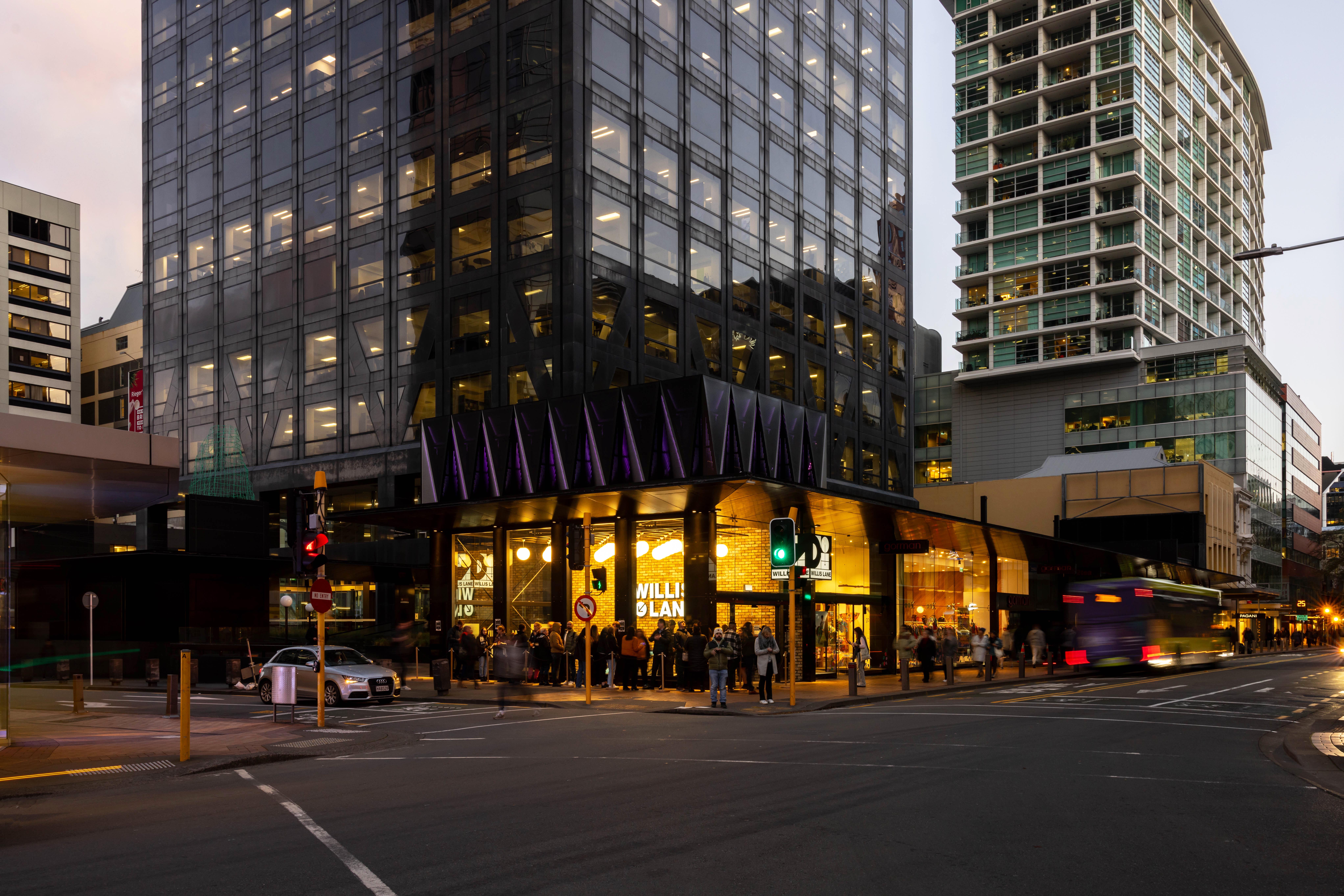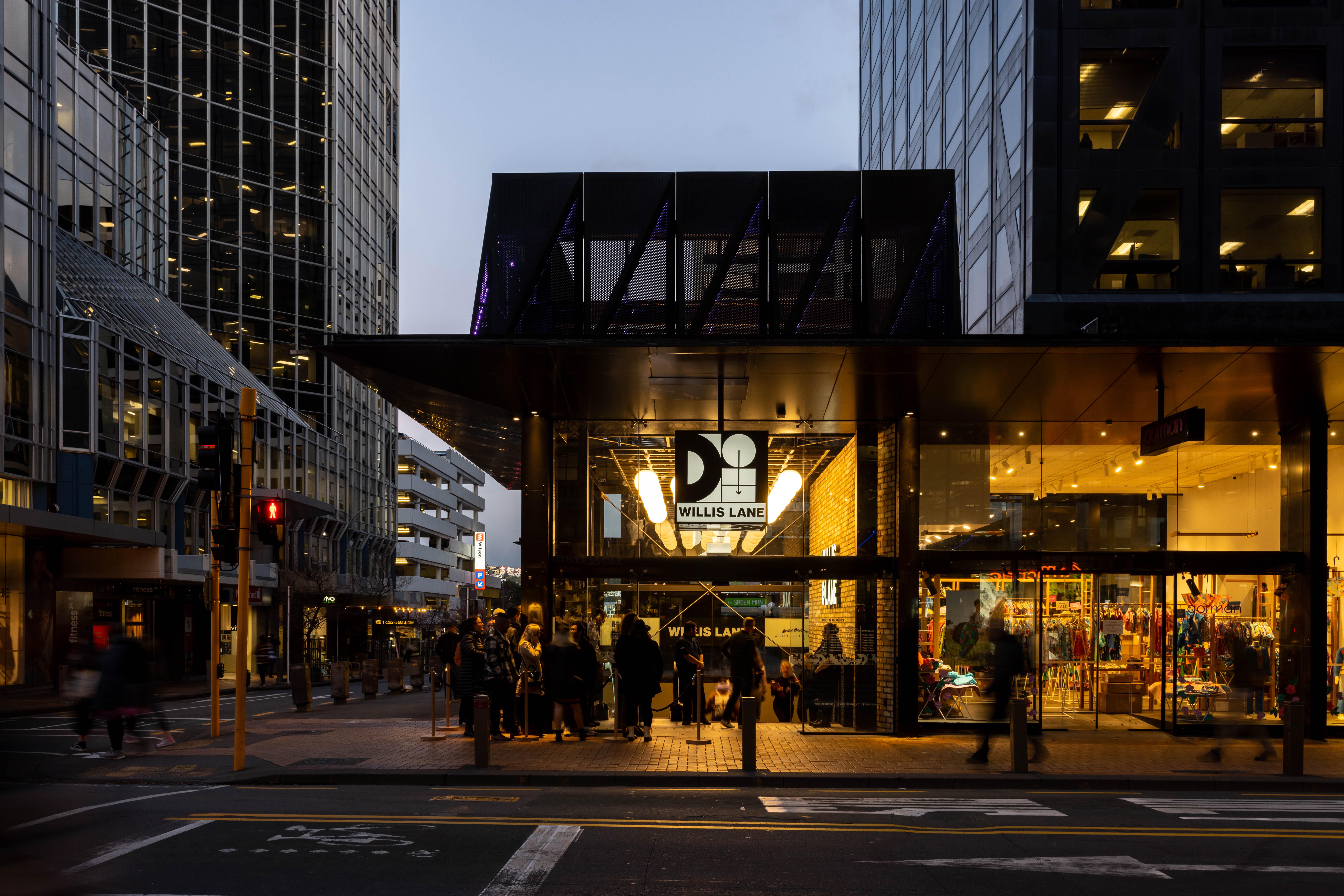 The project involves a series of transformative works to an important part of the city. Seemingly small interventions streetside belie an extensive remediation project below ground, which transform neglected retail into a hospitality and entertainment destination. Converting what was once a blank façade into an active corner building – replete with party hat – the project now celebrates this significant intersection of Willis Street and Lambton Quay. This new city marker provides entry to a revitalised subterranean precinct and is supported by an enlivened second entry on Willis Street. Fine-grained details demonstrate an astute understanding of how to leverage broader public benefit from a discreet number of moves. The project anticipates further development in this part of the city and signals expectations for the delivery of quality public interfaces.
