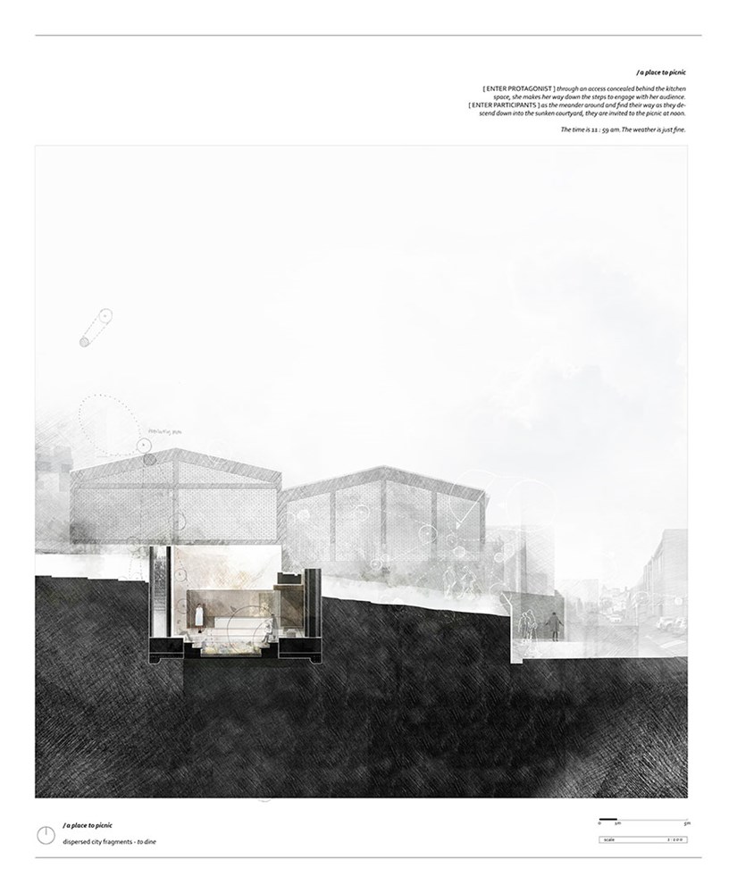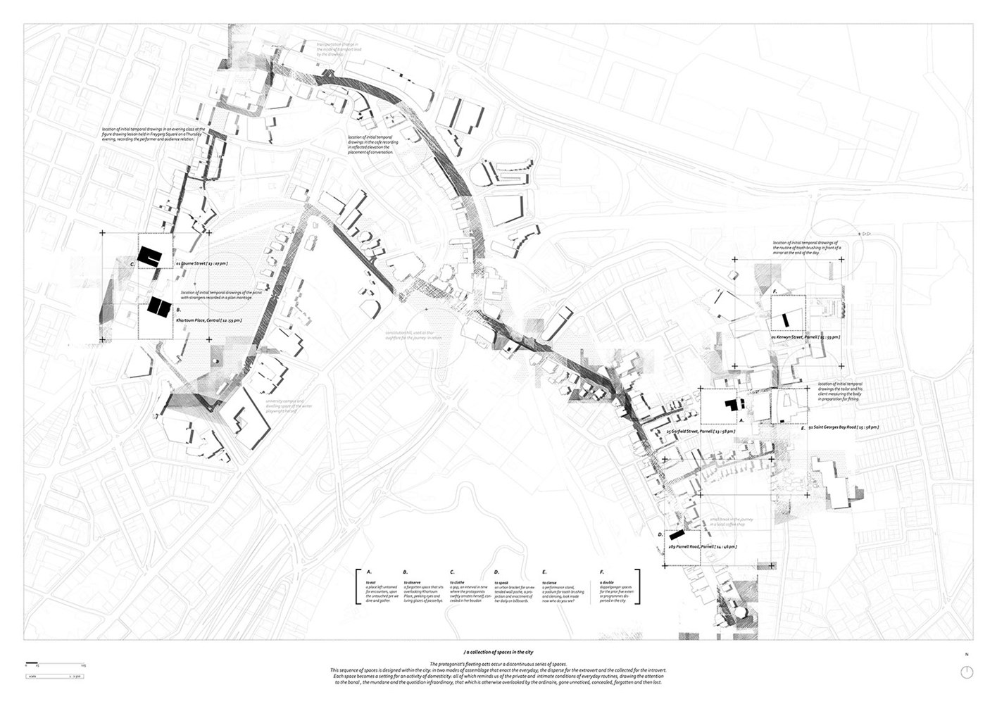 This project focuses on the role of drawing in the presence of an event, in locating and engaging participants and observers in a series of theatrical acts set within a discontinuous series of city spaces occupied by a performer. Here, architecture is a vehicle for a theatre of the everyday. The spaces are settings for portrayals of domesticity – eating, brushing teeth, dressing. They are a reminder of the private and intimate conditions of everyday routines.
