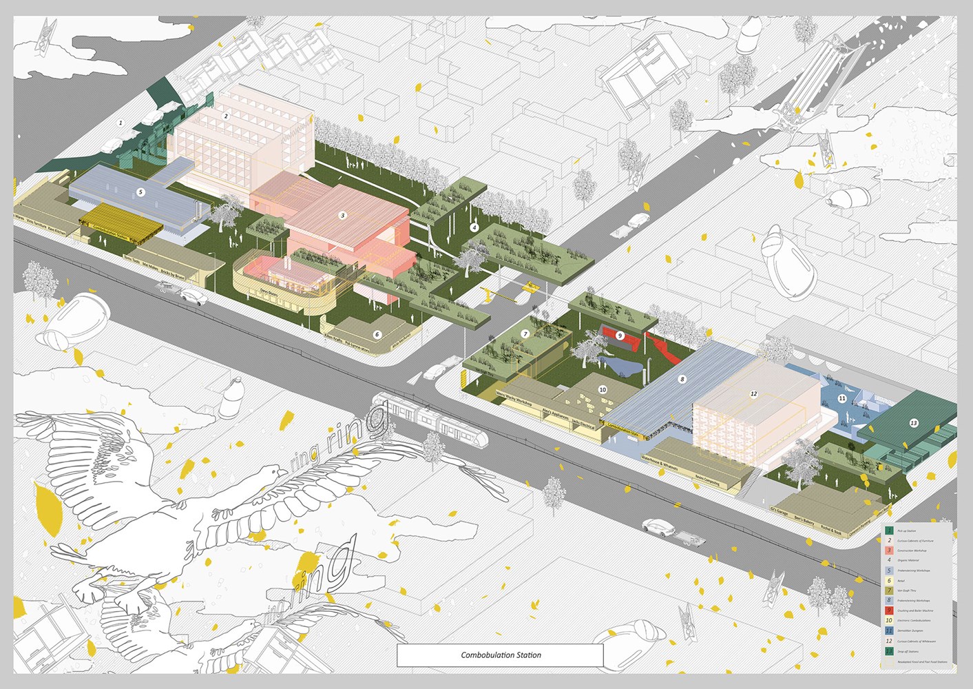 The proposal is a neighbourhood-scale intervention, culminating in the form of a ‘combobulation station’. This is an uncanny anthropocenic re-interpretation of what we know today as community recycling centres: facilities that handle the processing, sorting and transferring of inorganic goods. This station represents my reaction to the feelings of discombobulation around currentclimate conversations, a place where familiarity with our everyday habits has been fragmented, provoking the uncanny and the surreal.
