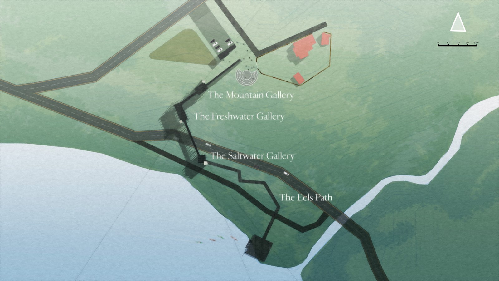 This Museum of Water aims to illuminate the whakapapa of Te Awa Tupua, and educate the public about the stories of its waters, the threats facing it today, and its colonial history, which includes New Zealand’s longest running legal dispute between Whanganui iwi and the Crown. These stories are contained within a humble yet beautiful museum architecture that is designed with strong ties to the landscape; the structures are oriented towards Matua Te Toa Tongariro (Mount Tongariro) and Te Tai-o-Rehua (Tasman Sea).