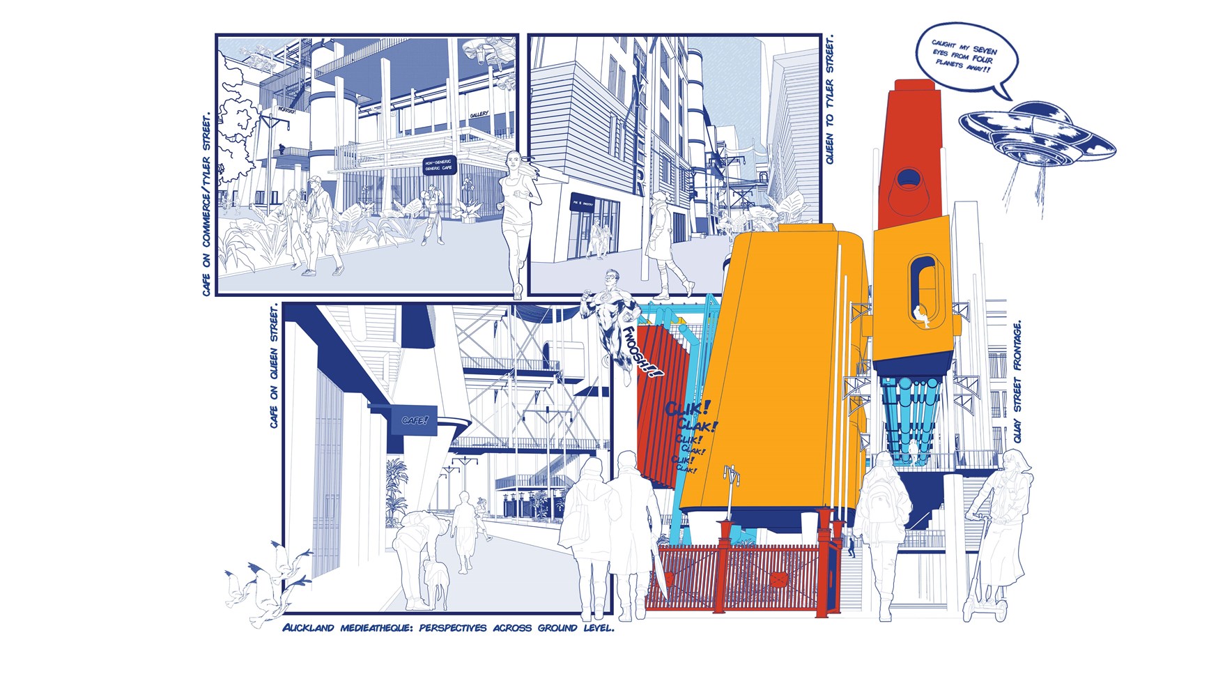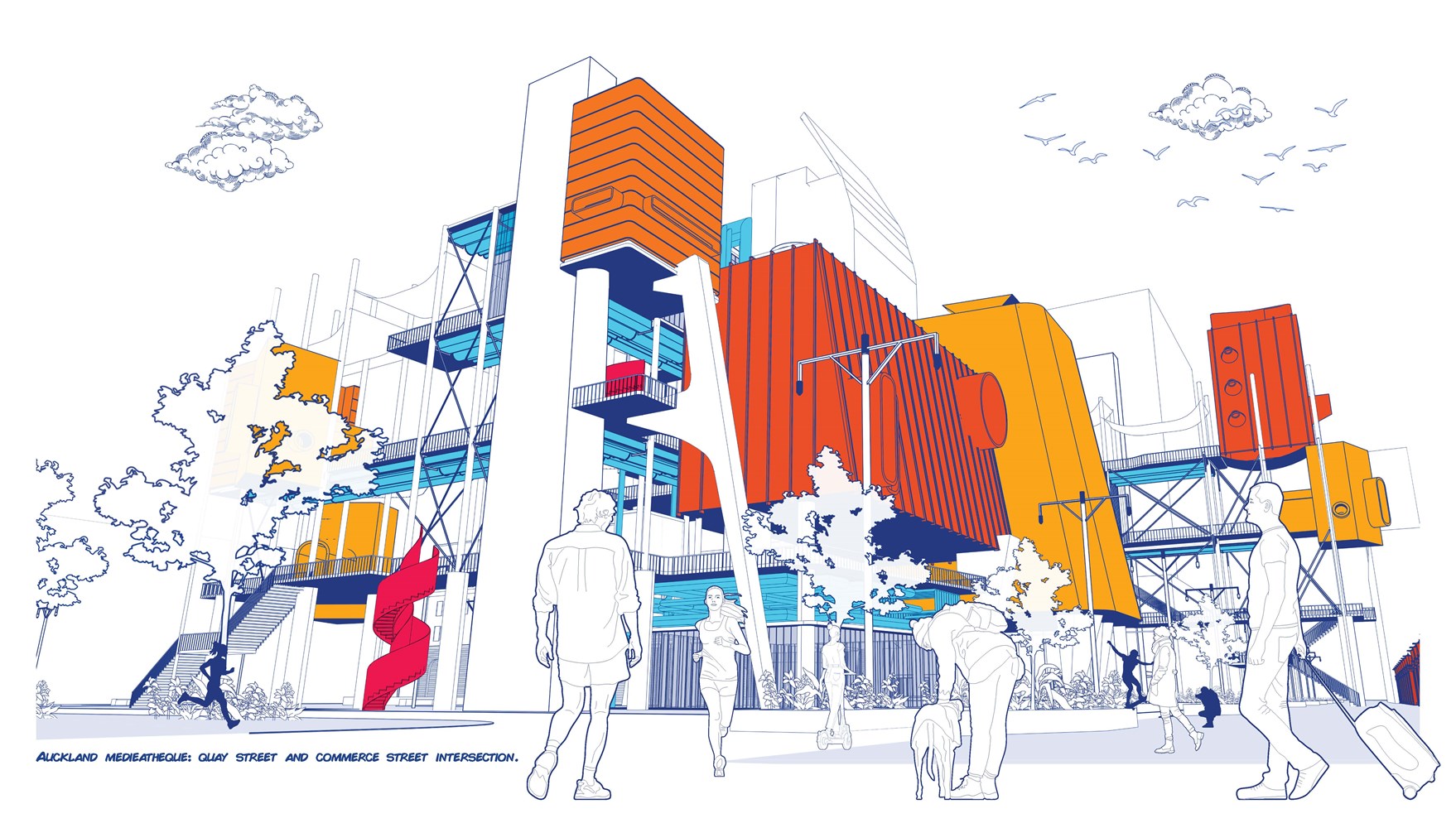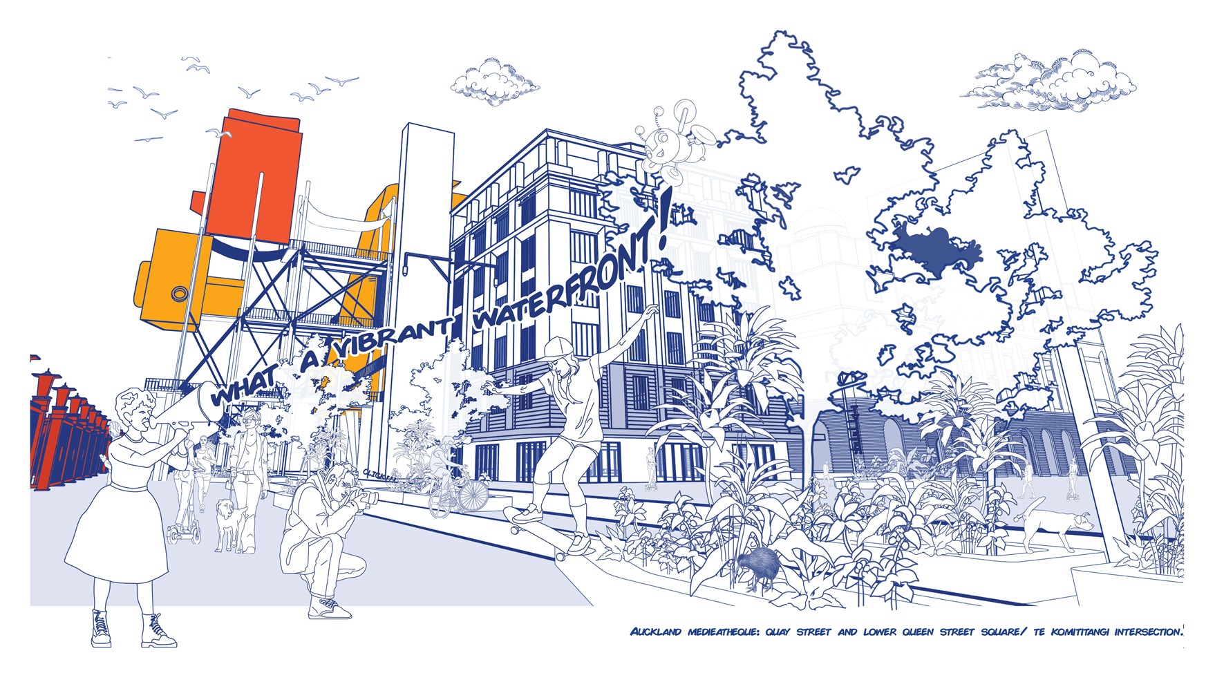 Thoughtfully placed at the nexus of public transit, newly created public space in the form of Te Komititanga, and at the gateway to the Waitematā, Siān’s project provides a place to land for the people of Auckland as they continue their journeys through the city. Through a fun and exciting series of drawings that view Tāmaki through a Pop-Art lens, he shows us the ways that people-centric design and pure, childlike joy are missing from the cityscape.