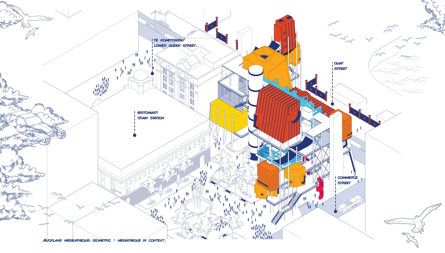 This colourful scheme for a multi-programme public space on Auckland’s waterfront provides a bright, retro-futuristic vision of how providing more opportunities for civic engagement could enrich the commerce-heavy central city.