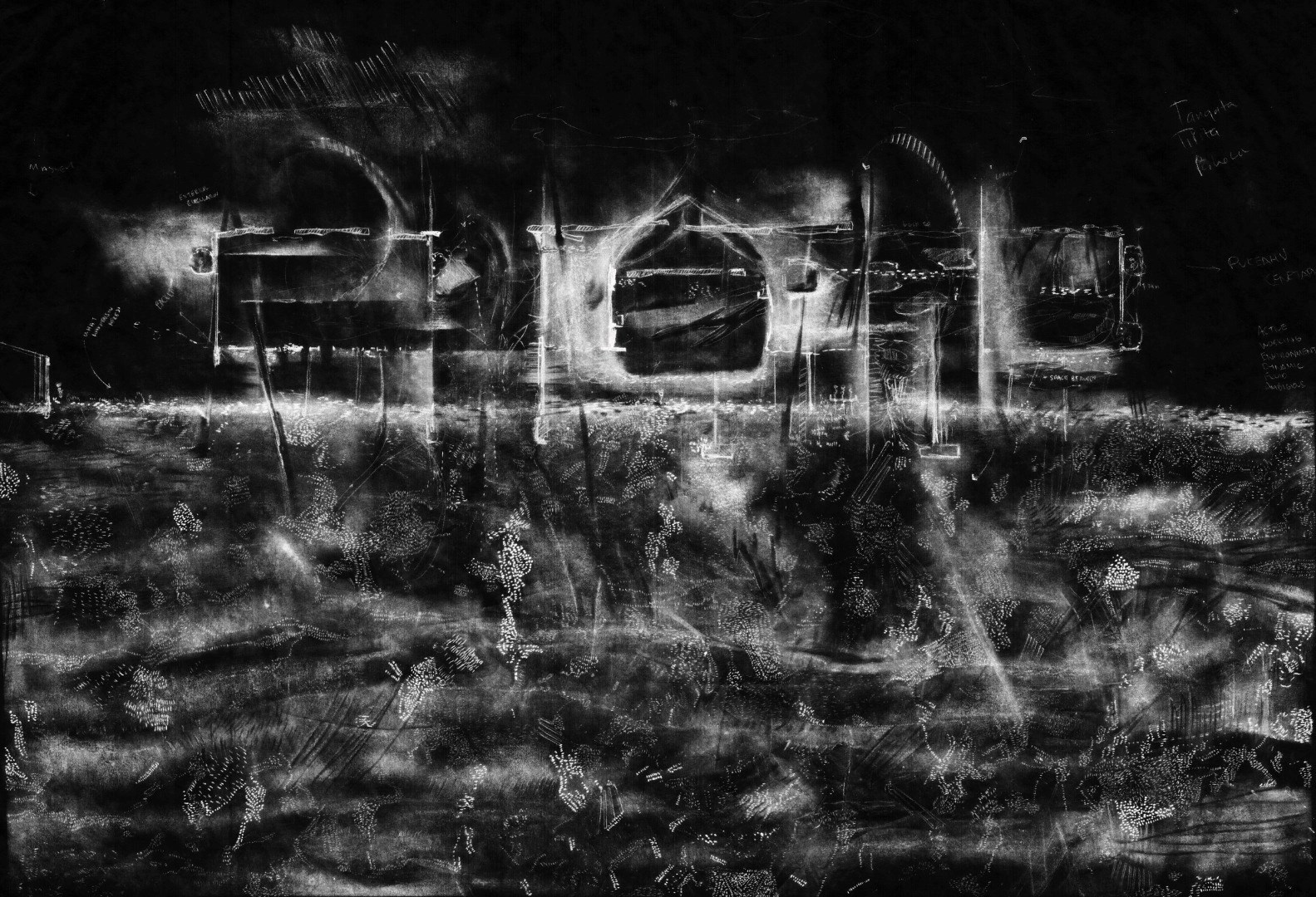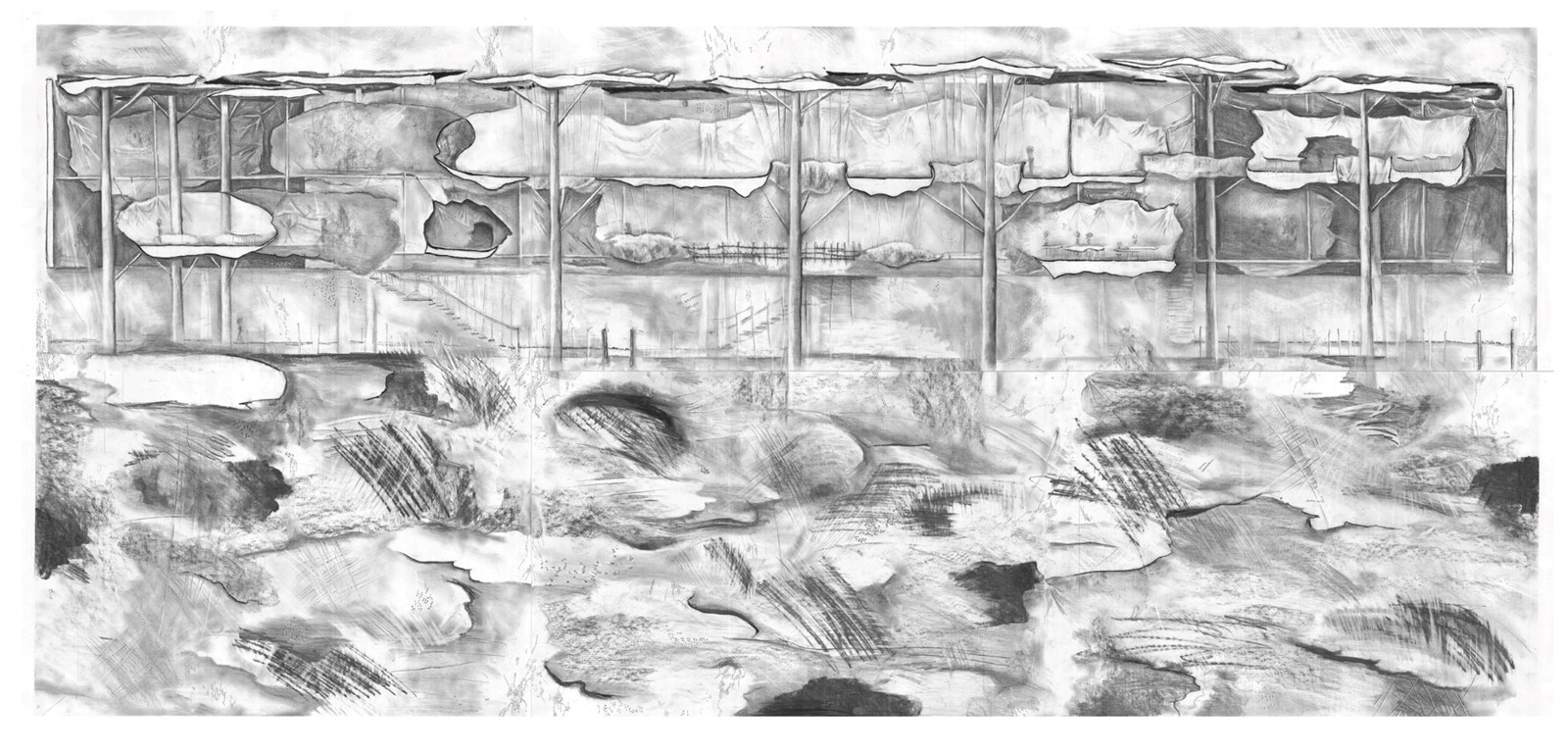 This ongoing project with abstract drawing explores connections between the ground and the body, culminating in the re-sketching of the historic Dominion Museum building in Wellington. The building’s solidity is dissolved and reimagined through intense, turbulent sketches, emergent from thinking about the ground beneath the building.