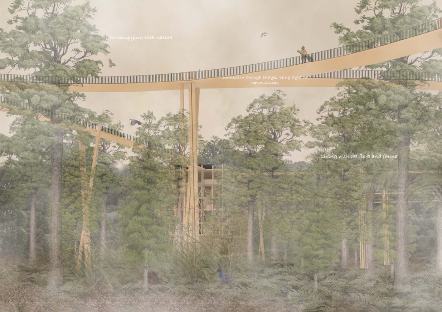 Through architecture grounded in Tikanga Māori at a physical, spatial and spiritual level, Tūhononga presents a new way of co-occupancy with taiao (the natural world) in Te Arawa and Aotearoa.