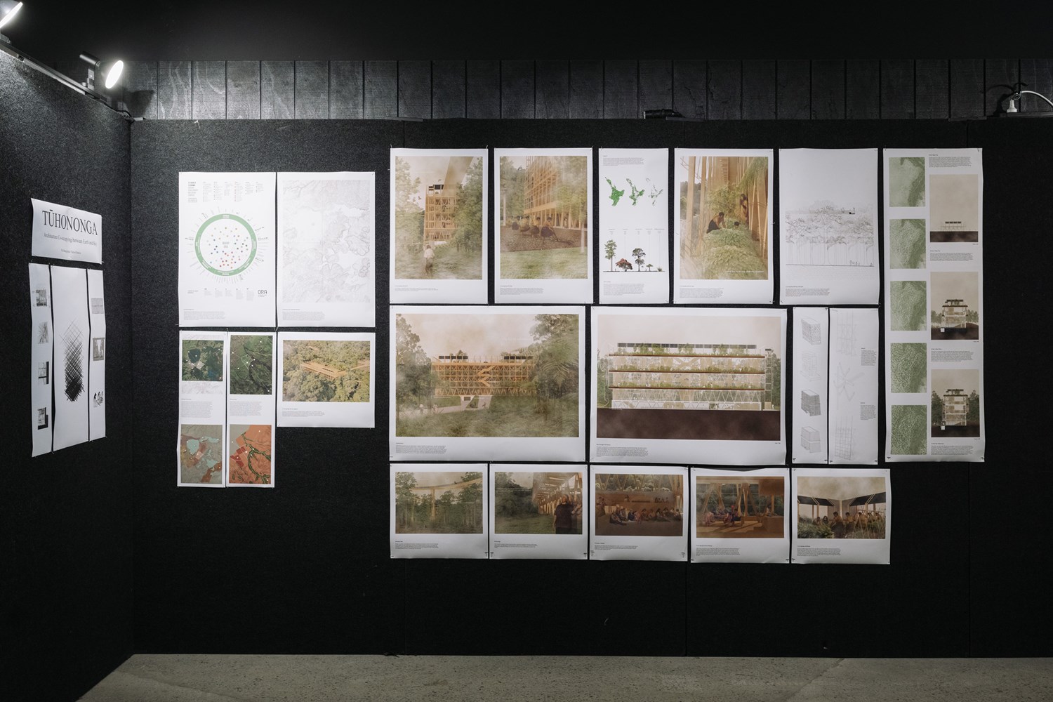 Tūhononga outlines the complex issues facing architecture in Aotearoa. Referring to our living and built environments within the Anthropocene, Tūhononga questions how we build communities and proposes successful co-occupancy with taiao (the natural world) as the answer. It presents a method for how one might consider spatially interacting with the physical and spiritual, and re-imagines how we can co-exist on earth between Ranginui (Sky Father) and Papatūānuku (Earth Mother).
