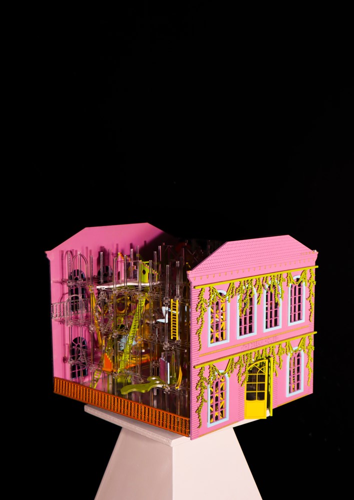 Lucid dreaming is present, as is living within imaginary spaces. It brings you back to your earliest memories. The models capture the imagination and the delicate scaffolding within the doll’s house sets up a space of safe imagining and dreaming. What’s intriguing is the idea of actors having sets around them and that architecture is purely a stage set, for which scenes unfold.