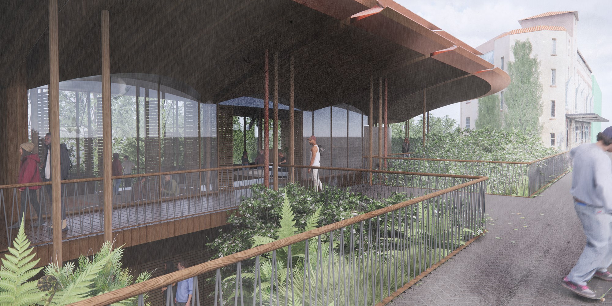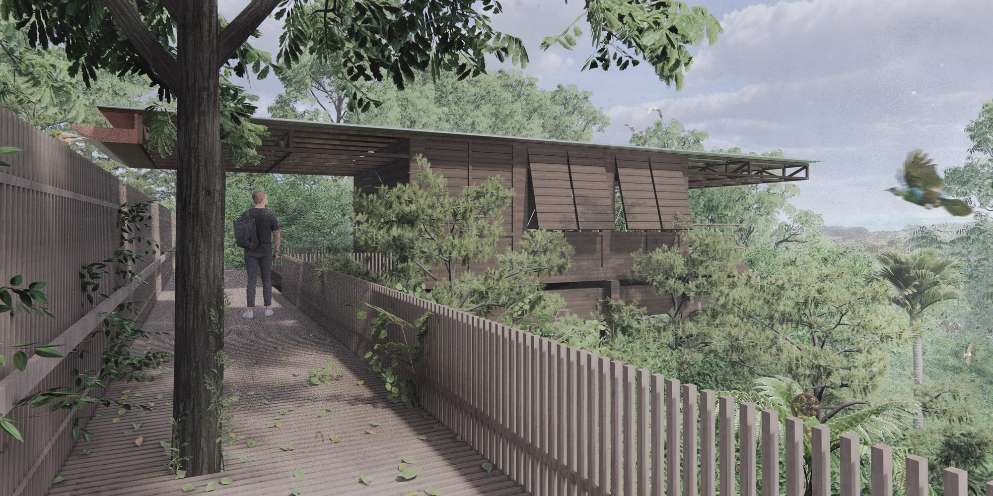 The rescripted building consolidates a therapeutic complex – ‘Fringe House’. The titular ‘Fringe’ is positioned firstly through Titirangi’s translation – ‘Fringe of Heaven’ – and secondly through its peripheral occupation at the city’s edge. The complex is triadic: ‘The Terrace’ – a meeting place and kitchen; ‘The Cabins’ – therapy spaces; and lastly, ‘The Makerspace’. These typologies leverage Titirangi's natural landscape, bohemian community and art culture, set to amplify emotional wellness and signalling the architecture’s kinship to place. Design motives arise from local architecture that fosters sincere reconciliation with its landscape. Accordingly, the structure is set back to foreground Indigenous bush, stormwater systems embrace Titirangi’s rainfall, and transparency maximises views and blurs a sense of inside-ness/outside-ness.