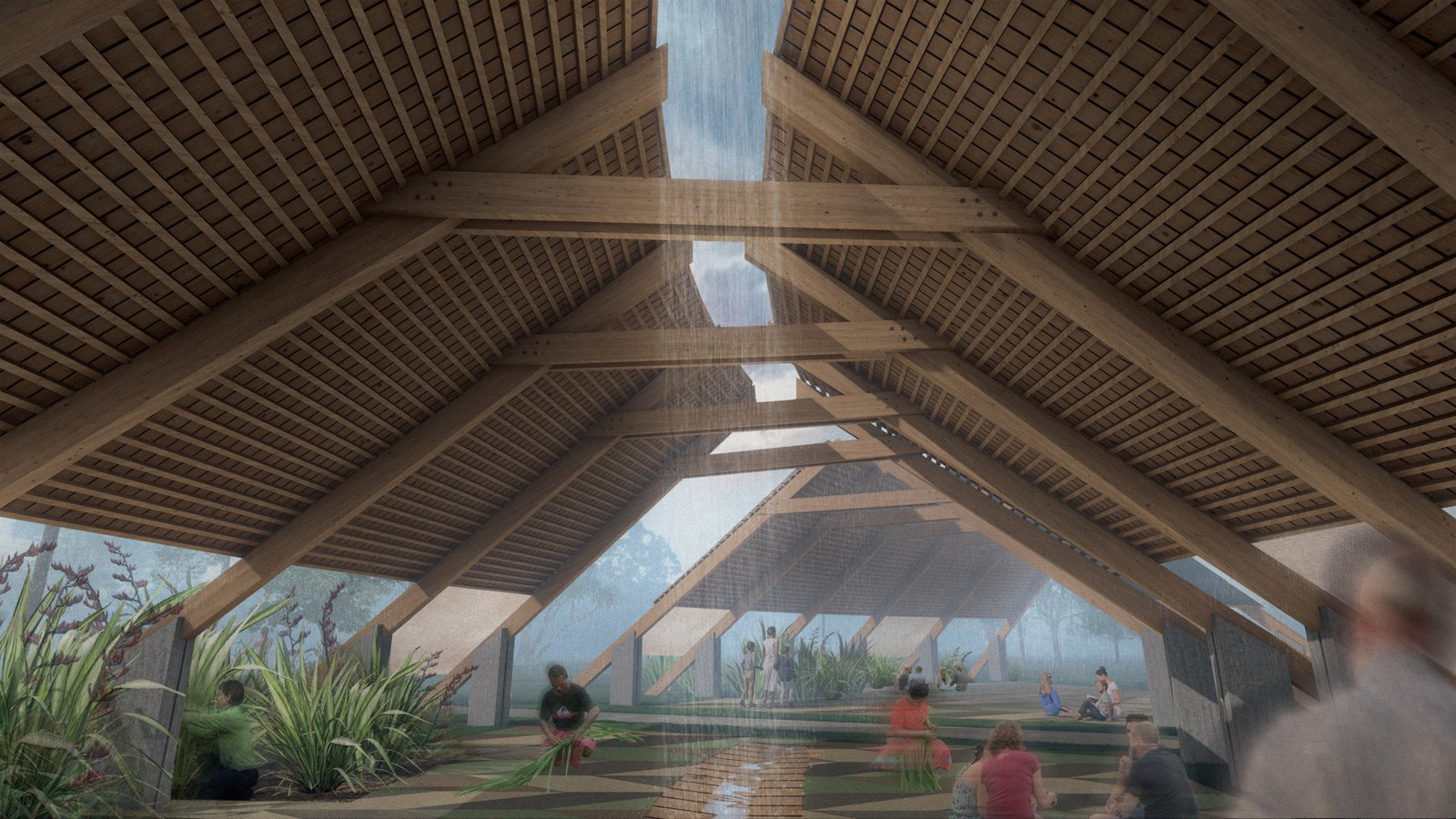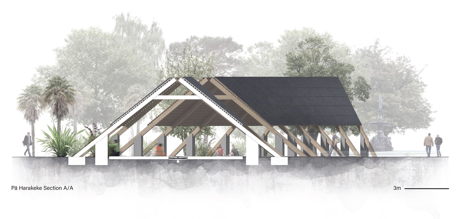The importance of the ridge in Māori architecture has been achieved by its absence and becomes a strong element. There is a lot of joy in placemaking and there are promising moments in this project designed for a public space.