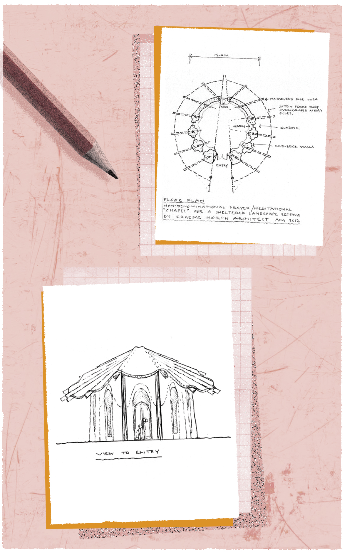 He didn’t look up as he spoke. He was urgent for the first time in weeks. Bent over his drawing board, his greying seabird’s-nest curls – the ones his mother loved, a halo – flecked the gold of his youth again in the slanting late afternoon light. His roll of translucent paper was stretched over the top of his plan, tacked down at the edges with masking tape. Between his fingers was his pencil stub – the only pencil I’ve ever seen him use, 4B, never quite sharp. He was carving with it now – soft, scooping circles. Beside him a jar of black and red pencil stubs, some used down to the bone.
