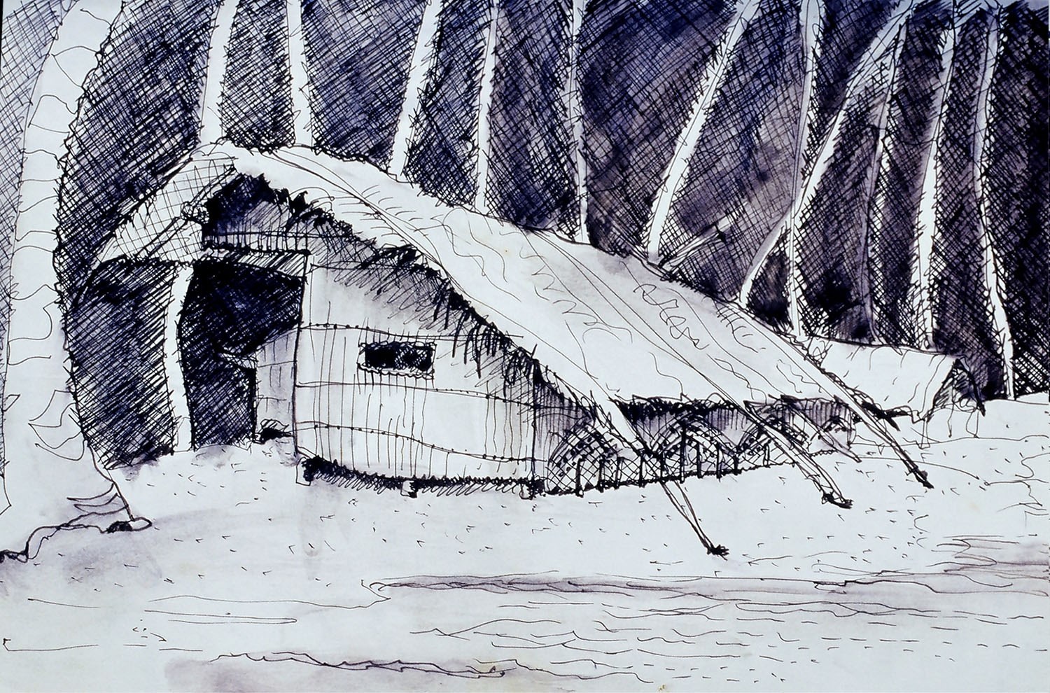 Mitchell’s Venice exhibition was influenced by his own experience of long sailing voyages through the Pacific. He and his partner Julie Stout – also a member of the exhibition team – spent years in the Pacific in the 1990s. “We saw and went into buildings that are Pacific buildings, made of sticks and thatch,” he says. “We liked them; they were architecturally interesting to us.” Here’s one of those buildings they visited: Leo’s House (gallery below, or click links to see images), in the Louisiade archipelago, Papua New Guinea, sketched by Mitchell in 1993. This was the third house Leo had built for himself; at that time, Mitchell says, he couldn’t help thinking that he hadn’t built one house for himself.