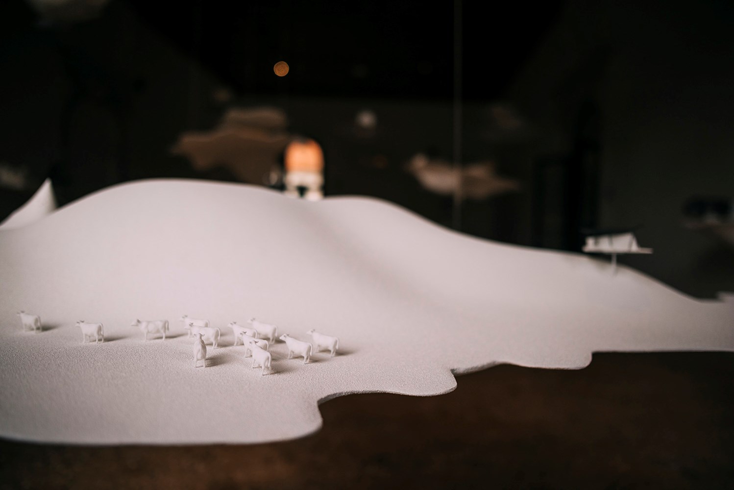 Well, the average size of a New Zealand dairy herd is 413 cows, and we have distributed that number of tiny, digitally printed cows in groups around the islands and models in the exhibition. Perhaps they’re cogitating about the architecture...