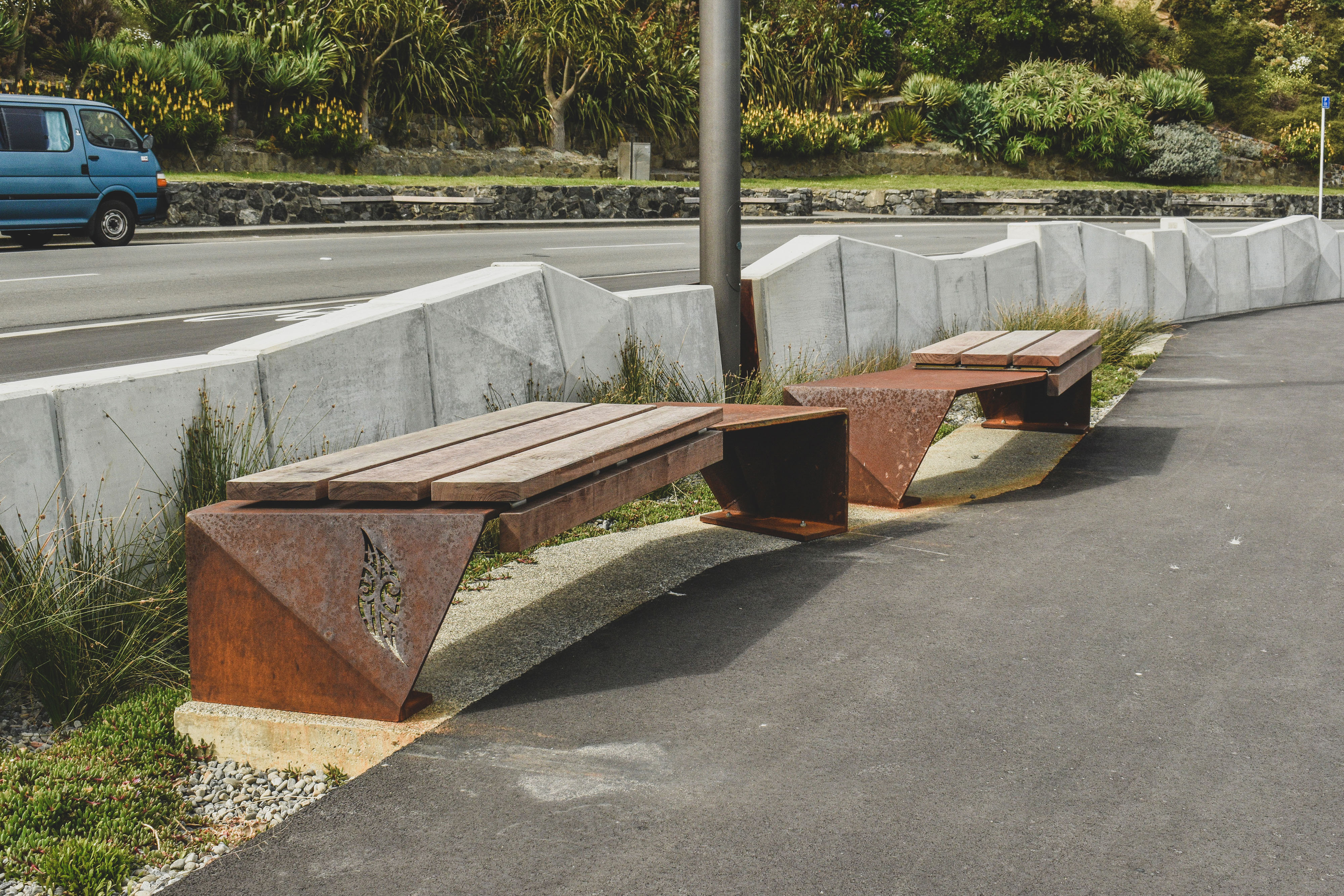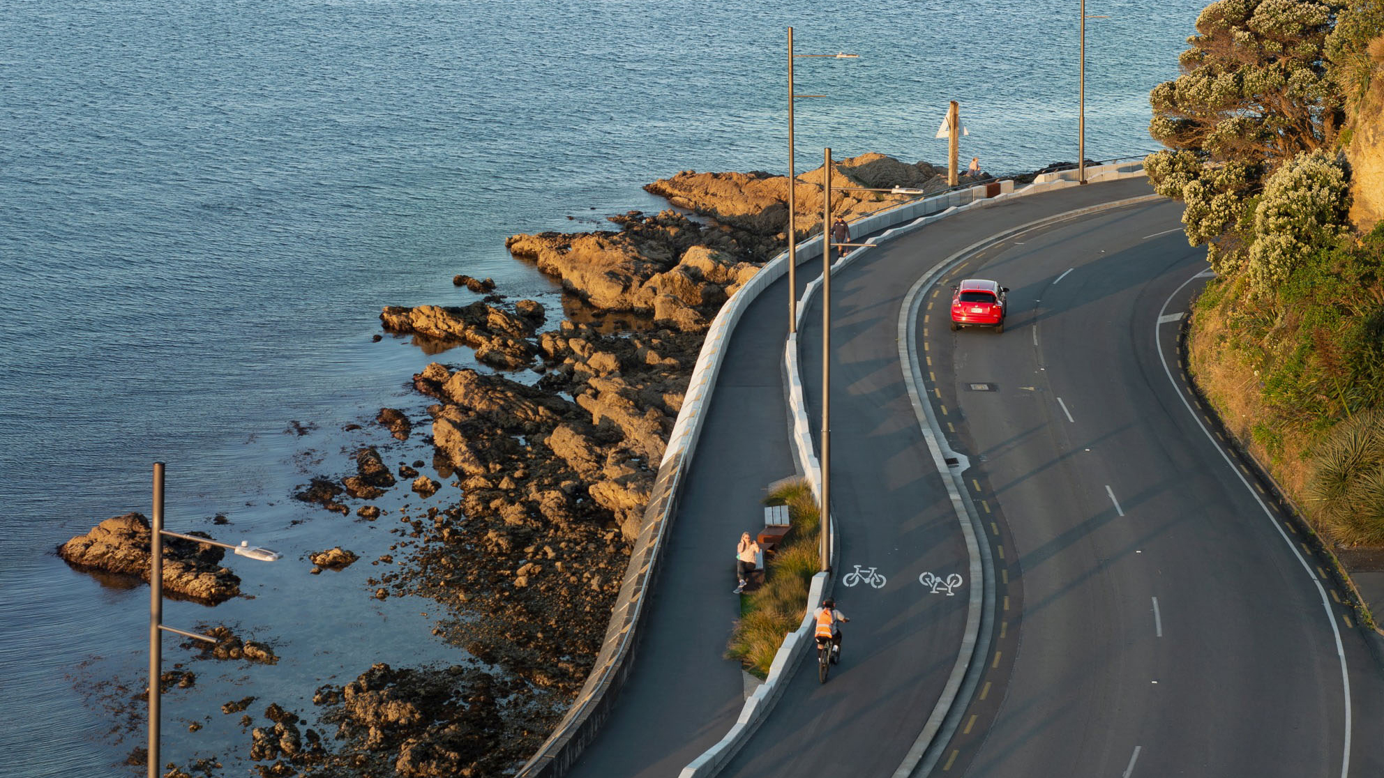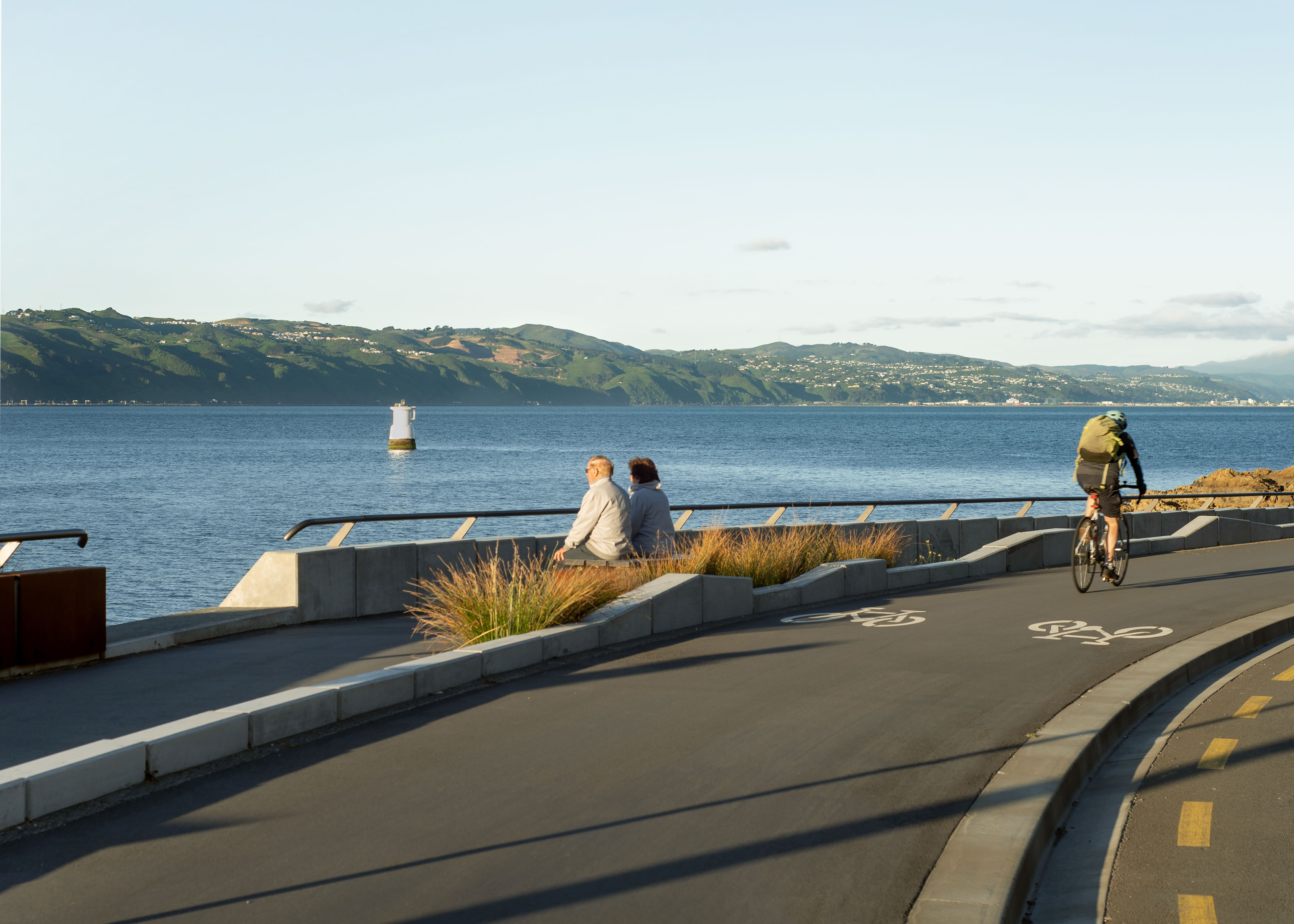 Ōmarukaikuru / Point Jerningham is a prominent section of walking and cycling infrastructure of Tahitai, (one tide, one journey) the coastal route from Oriental Bay around Evans Bay. Ōmarukaikuru comprises pathways for cyclists and pedestrians, a series of projecting outlooks, ‘barnacles’, resting spaces and access points to the rocky foreshore. The design references and responds to the context on many levels; cultural naming of whenua with Taranaki Whānui, tohu design, marine ecosystem, coastal resilience and natural rock formations of this rugged coast. A simple and rustic material palette of exposed aggregate and asphalt give clear cues for different path users, facetted precast concrete and corten steel for feature structures softened by hardwood timber inlays and hardy coastal planting celebrates this rugged exposed environment.